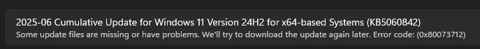 在 KB5060842 发布初期,许多用户报告无法正常接收或安装该补丁。部分用户在尝试更新后收到错误提示:“部分更新文件缺失或存在问题,稍后将重试下载。错误代码:(0x80073712)。”