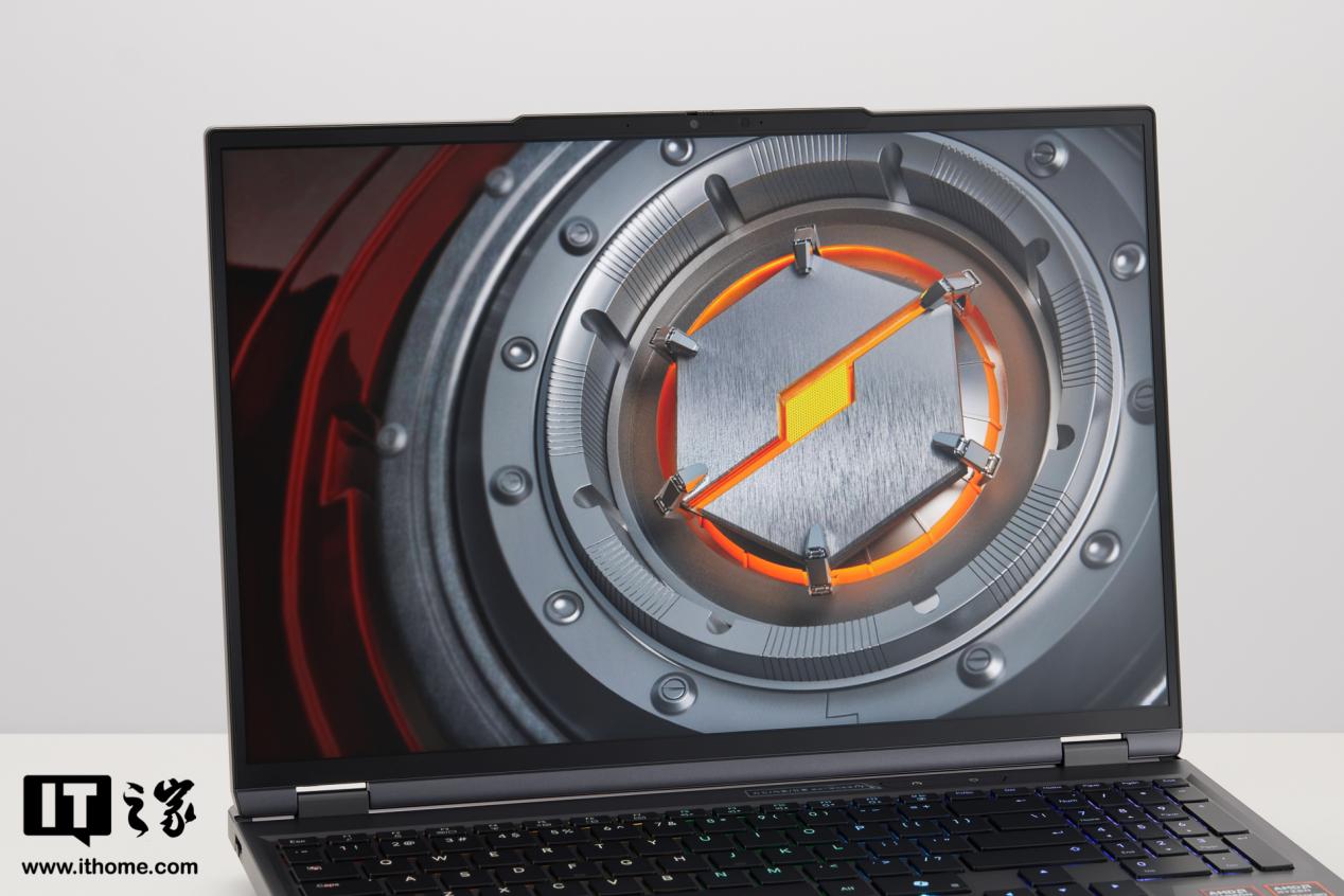 笔记本的 B 面是一块 16 英寸的 MiniLED 耀月屏,屏幕左右两侧的边框比较窄,上下部分略宽一些,同时顶部还有凸起的 1080p IR 红外摄像头和传感器区域,这种设计也方便用户平时打开笔记本。