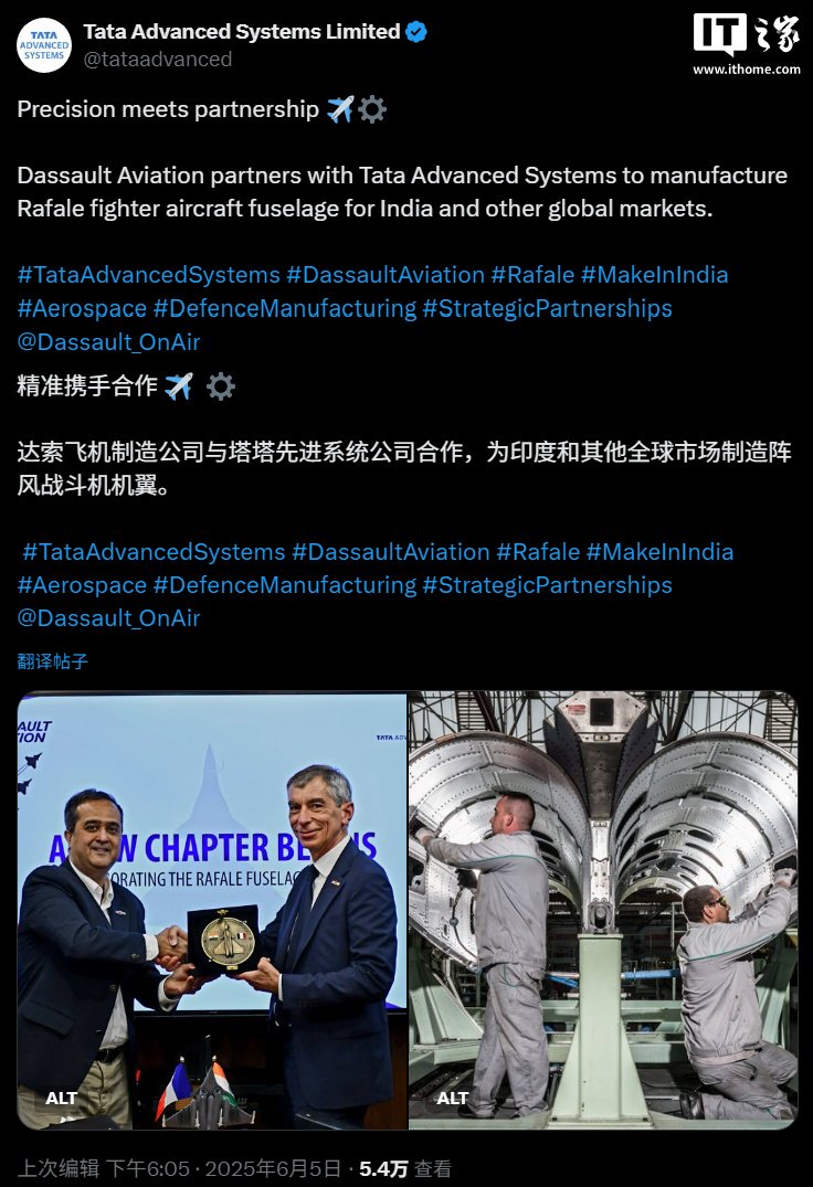 IT之家 6 月 12 日消息,Tata Advanced Systems(印度塔塔先进系统公司)公司 6 月 5 日宣布,法国达索飞机制造公司与塔塔先进系统公司合作,为印度和其他全球市场制造阵风战斗机的机翼。
