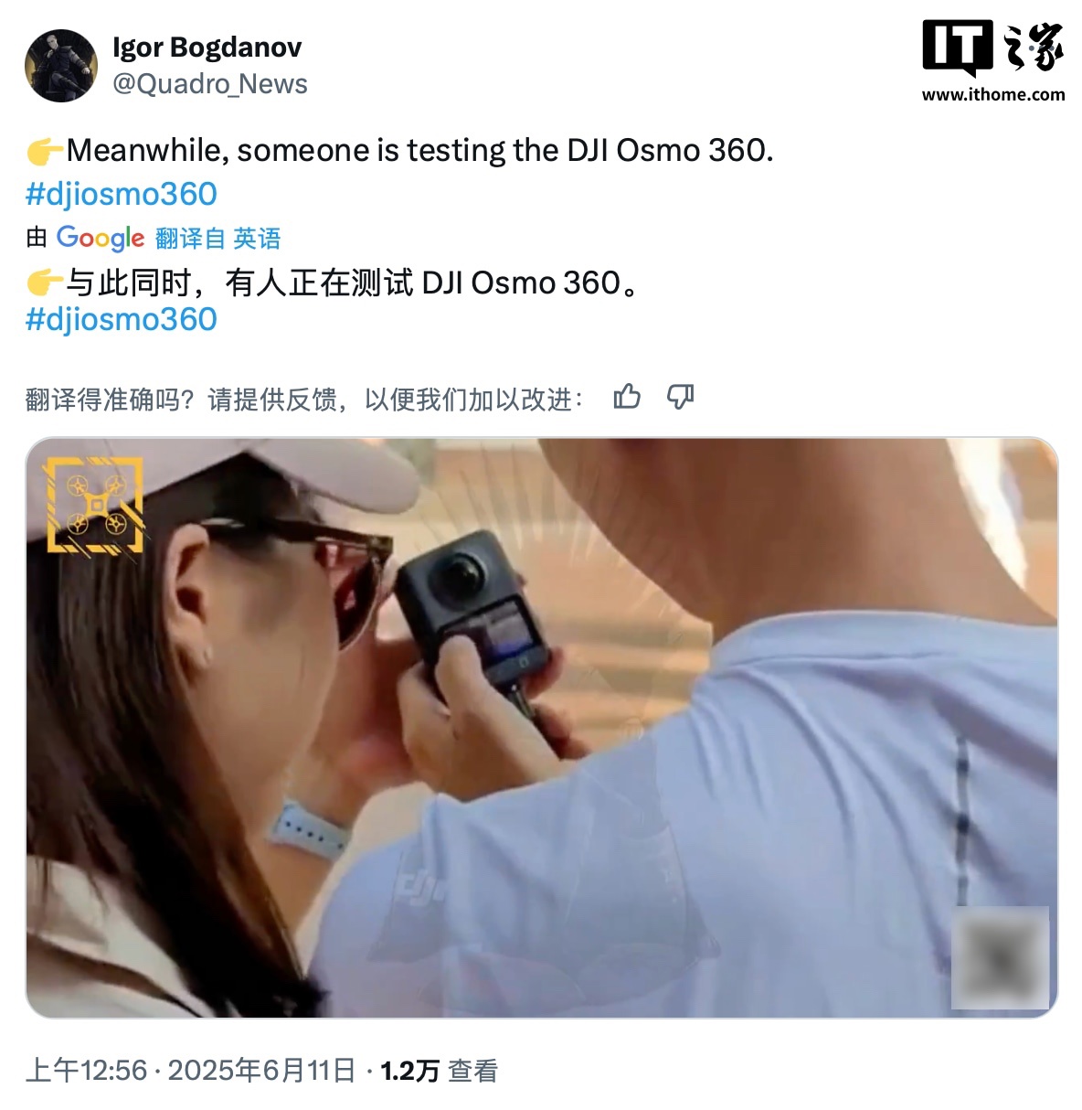 IT之家 6 月 12 日消息,爆料人 Igor Bogdanov 昨日于 X 平台分享了一段视频,视频中尚未发布的大疆 Osmo 360 全景相机疑似再度现身公共场合。