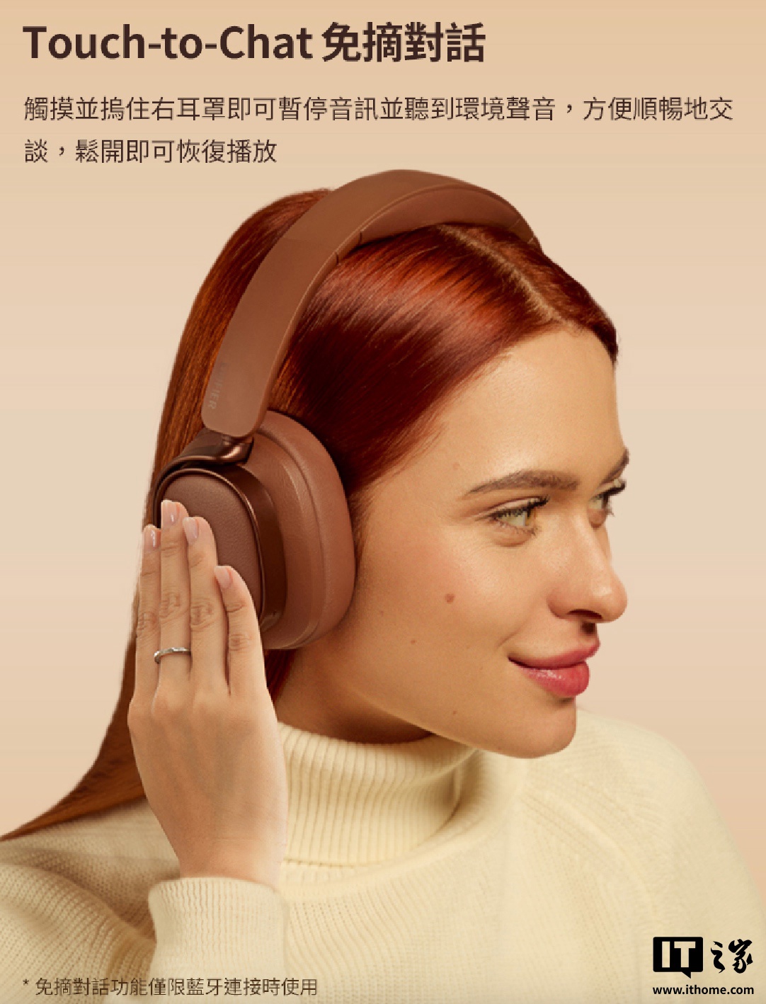 使用体验方面,该耳机支持 AI 通话降噪,可在通话过程中降低背景杂音,搭载“Touch-to-Chat 免摘对话”功能,需要对话时可捂住右耳耳罩,即可暂停音乐并开启环境声模式,方便顺畅交谈,松开即可恢复播放。