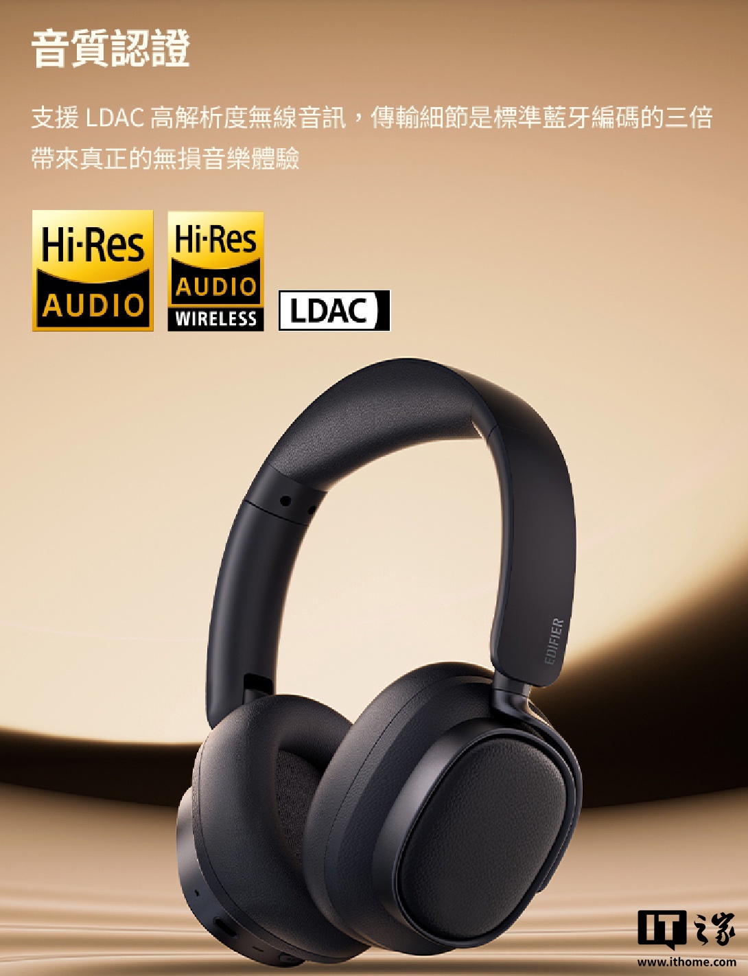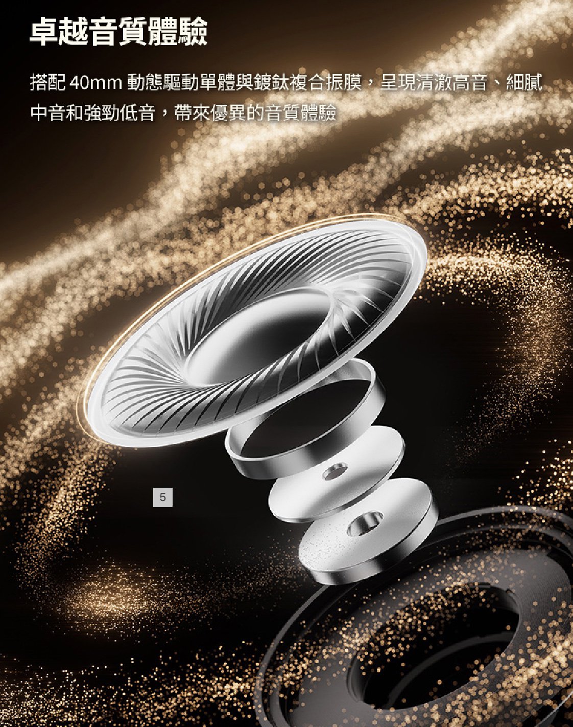 硬件参数方面,该耳机采用 40mm 动圈单元与镀钛复合振膜,可呈现“清澈高音、细腻中音和强劲低音”,支持蓝牙 5.4 无线和 USB-C 有线连接,编解码器方面支持 SBC、AAC 和 LDAC,其中 LDAC 可“还原无损音乐”。