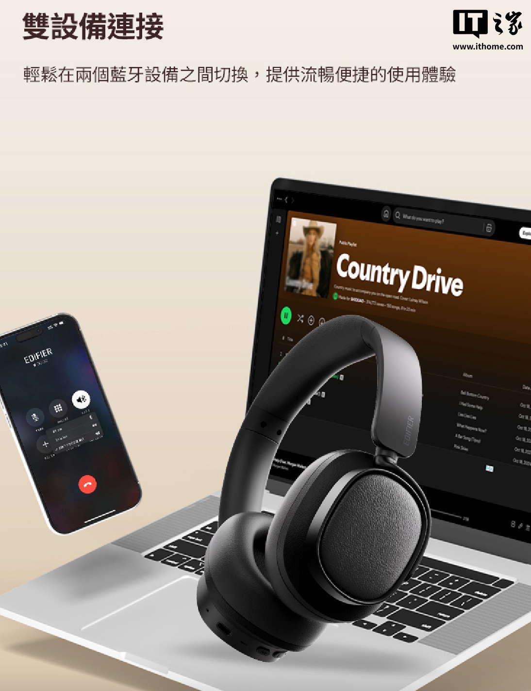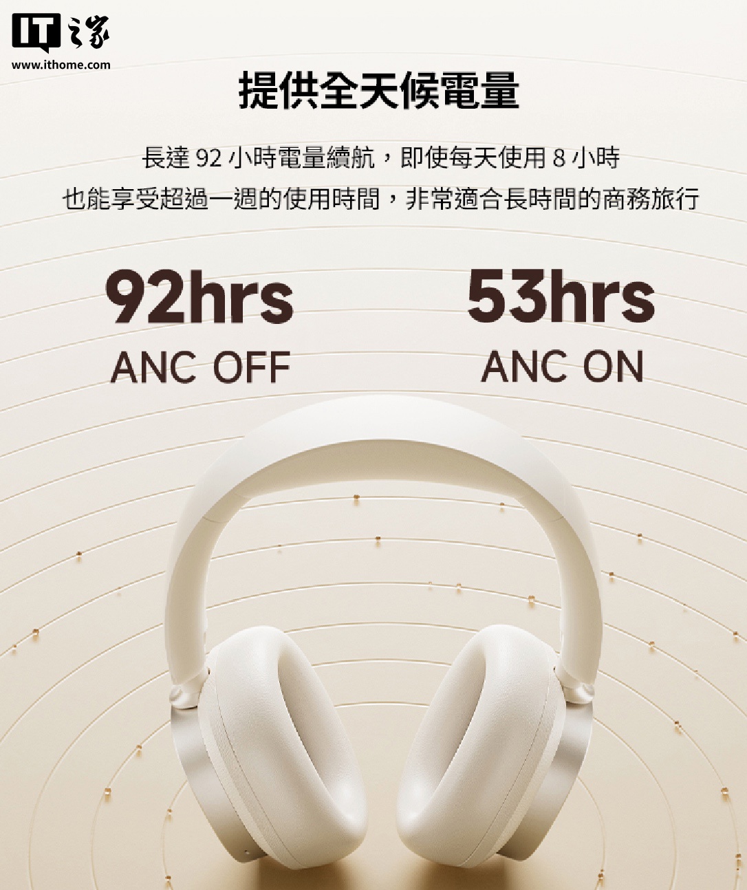 据漫步者介绍,该耳机最长续航可达 92 小时(降噪关),采用人体工学设计,机身采用轻量化设计,重量 265 克;耳机的耳罩部分可多角度旋转,适配不同头型,耳罩接触面采用记忆海绵搭配亲肤皮革,可带来舒适佩戴体验。