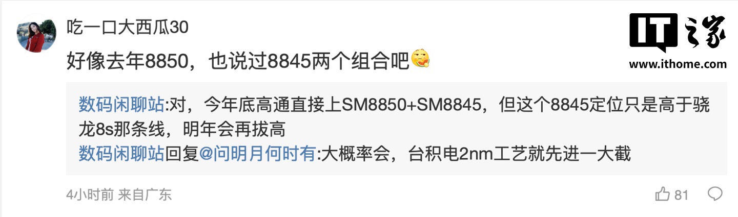 有网友于评论区询问该博主“好像去年 8850,也说过 8845 两个组合吧”,该博主首先表示了肯定,并表示高通今年底会“直接上 SM8850+SM8845”,但 8845 的定位“高于骁龙 8s 那条线”,明年会再拔高。