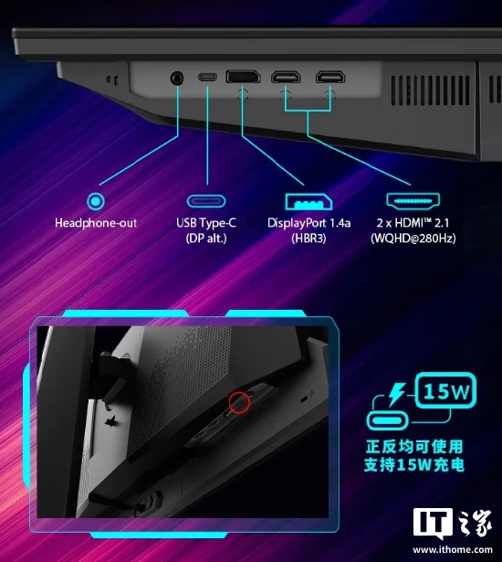 接口方面,新款和老款保持一致,即 HDMI 2.1 满血版 + DP1.4A 使用组合,并支持 Type-C 接口,可提供 15W PD 协议充电。