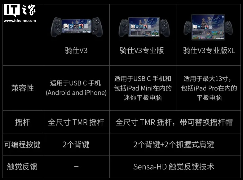 雷蛇骑仕 V3 系列适用于绝大多数主流移动设备(XL 兼容主流平板尺寸),配有全尺寸 TMR 摇杆(专业版支持可替换摇杆帽)。