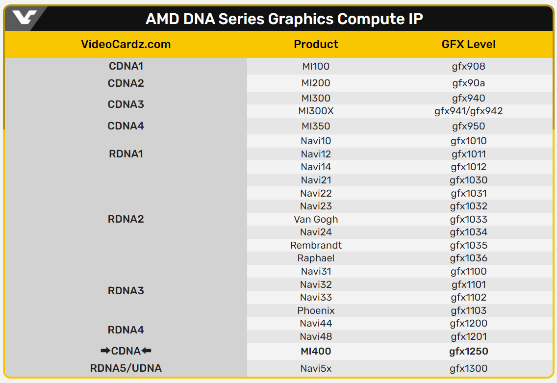 自从第一代 CDNA 和 RDNA 架构发布以来,AMD 通常会为特定产品添加新的 ID。第一代 CDNA 出现为 GFX908,GFX900 分支被用于 CDNA3(Instinct MI300 系列)。而更高的 ID 被分配给被称为 RDNA 的游戏系列。