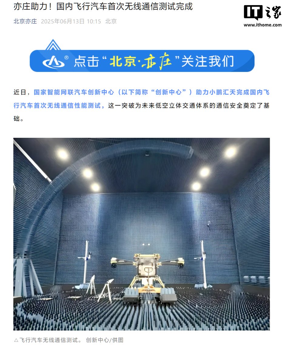 IT之家 6 月 13 日消息,IT之家从北京亦庄公众号获悉,国家智能网联汽车创新中心助力小鹏汇天完成国内飞行汽车首次无线通信性能测试,这一突破为未来低空立体交通体系的通信安全奠定了基础。