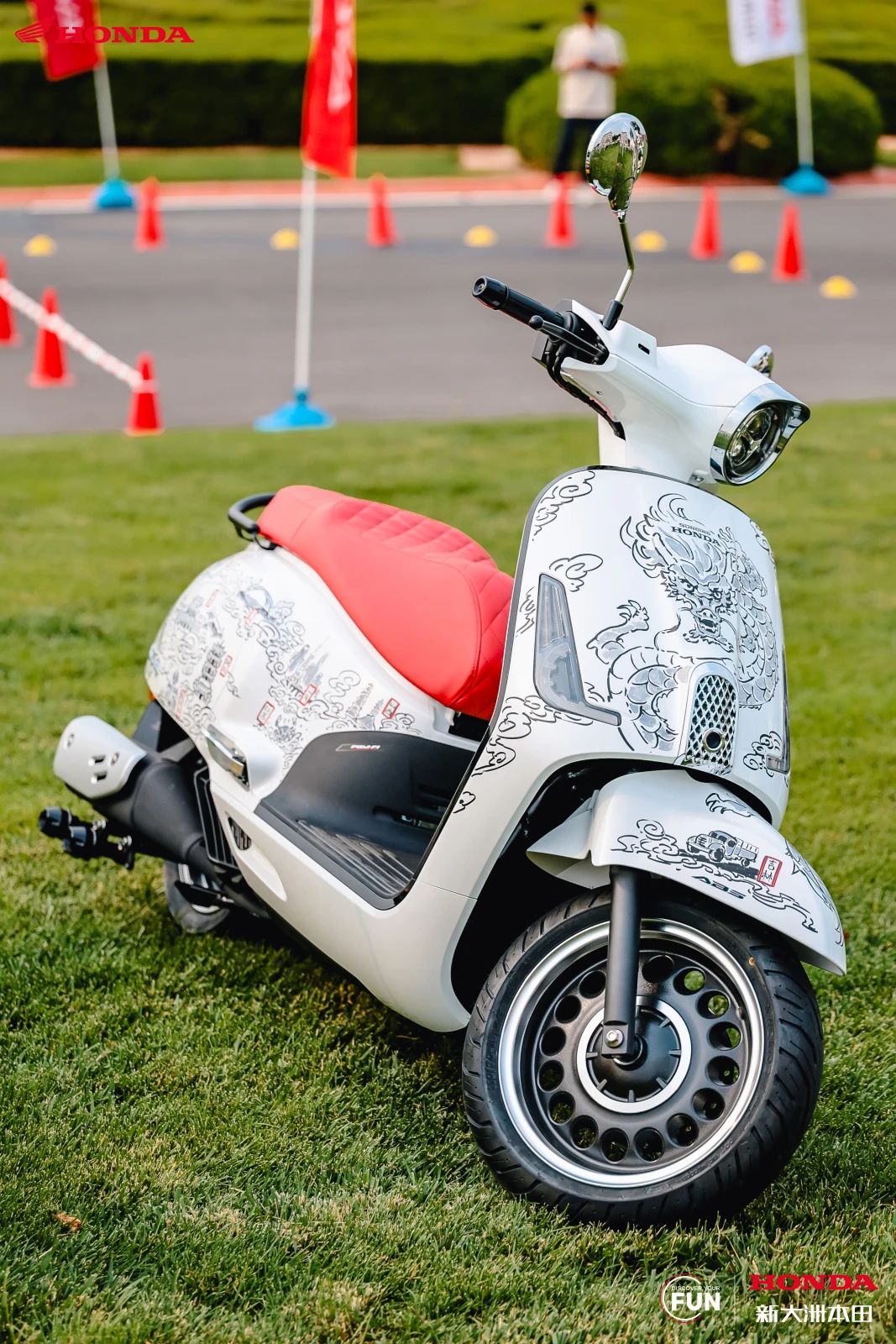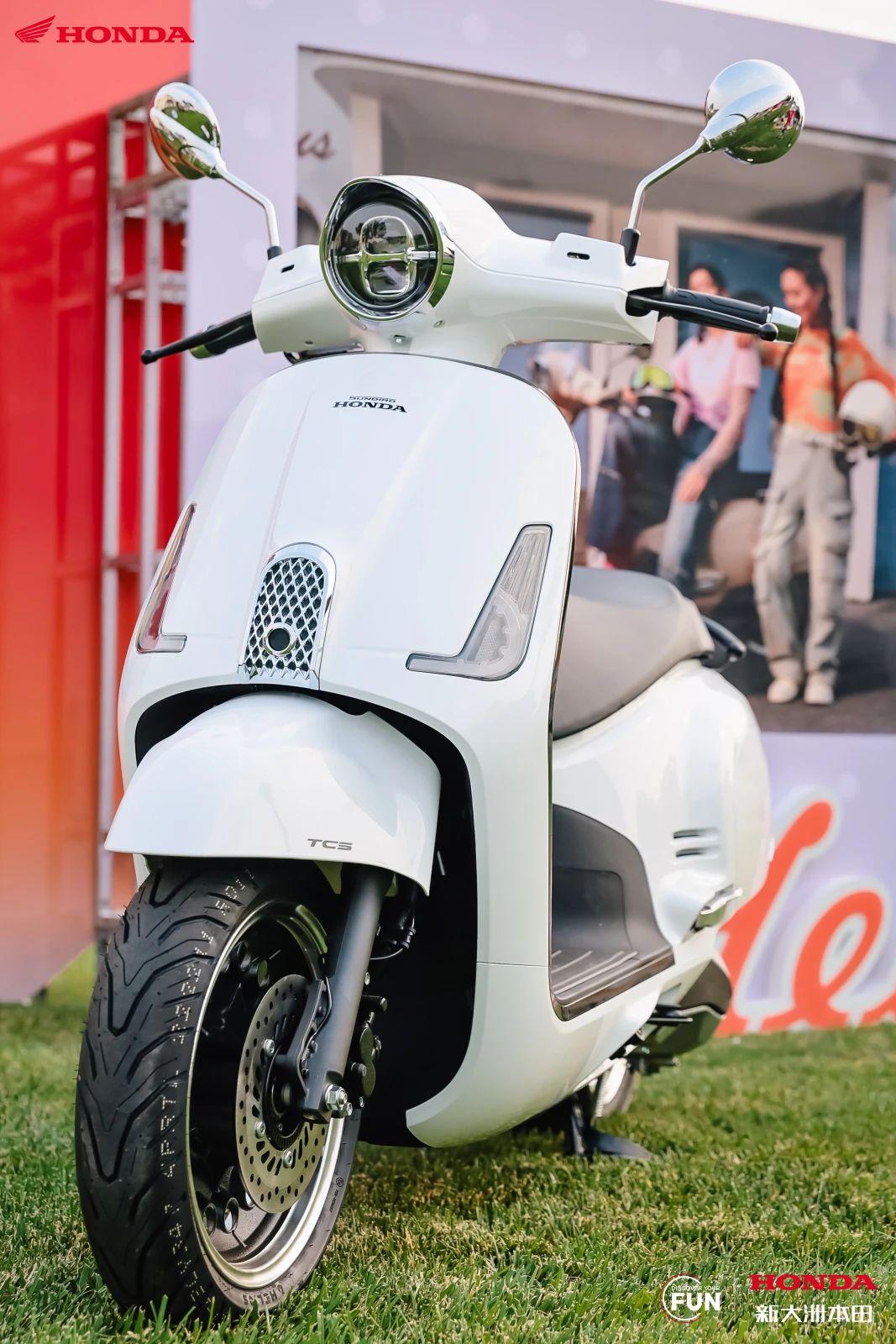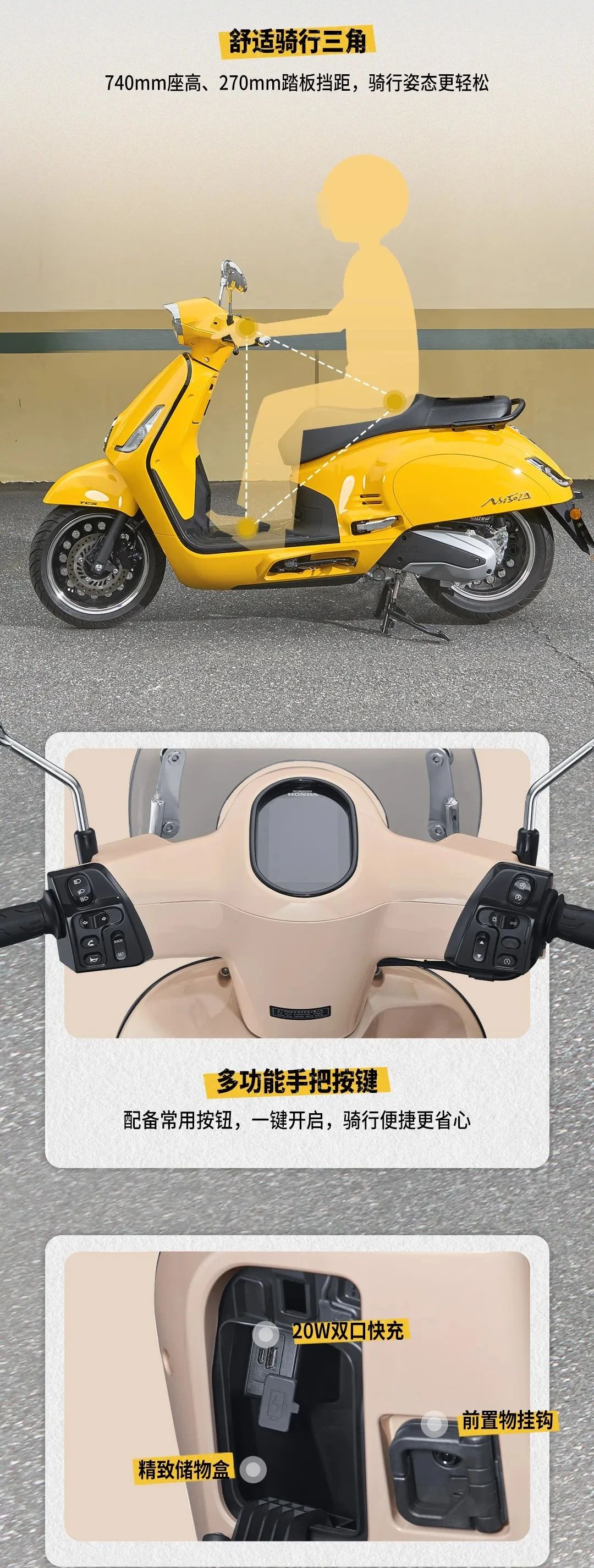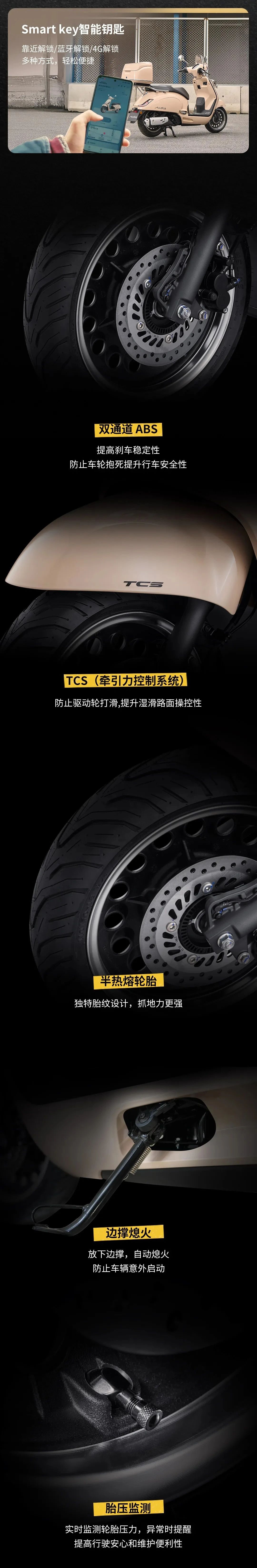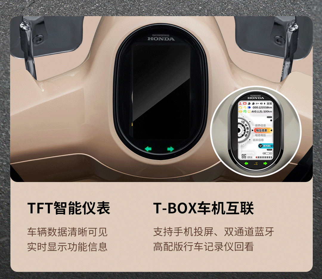 此外,这款车型还配备了静音启动、自动启停以及 PGM-FI 智能电喷系统;全系标配双通道 ABS+TCS、半热熔轮胎,并进行了环形挖孔处理的前后 13 寸轮毂;前置储物空间有一个带盖的储物格,内置 20W 双口快充(A+C)。
