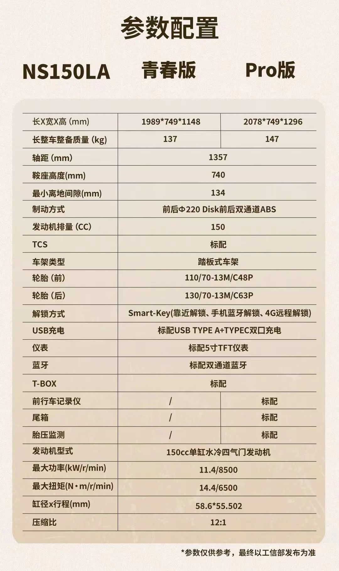 配置方面,NS150LA 发动机采用 NS150GX 同平台的 SH-EP 单缸水冷四气门发动机,最大功率 11.4kW / 8500rpm,最大扭矩 14.4N.m/ 6500rpm,最大马力 15.5 匹,极速 107km/h,实际排量 149.7cc,相较 NS125LA 提升显著。