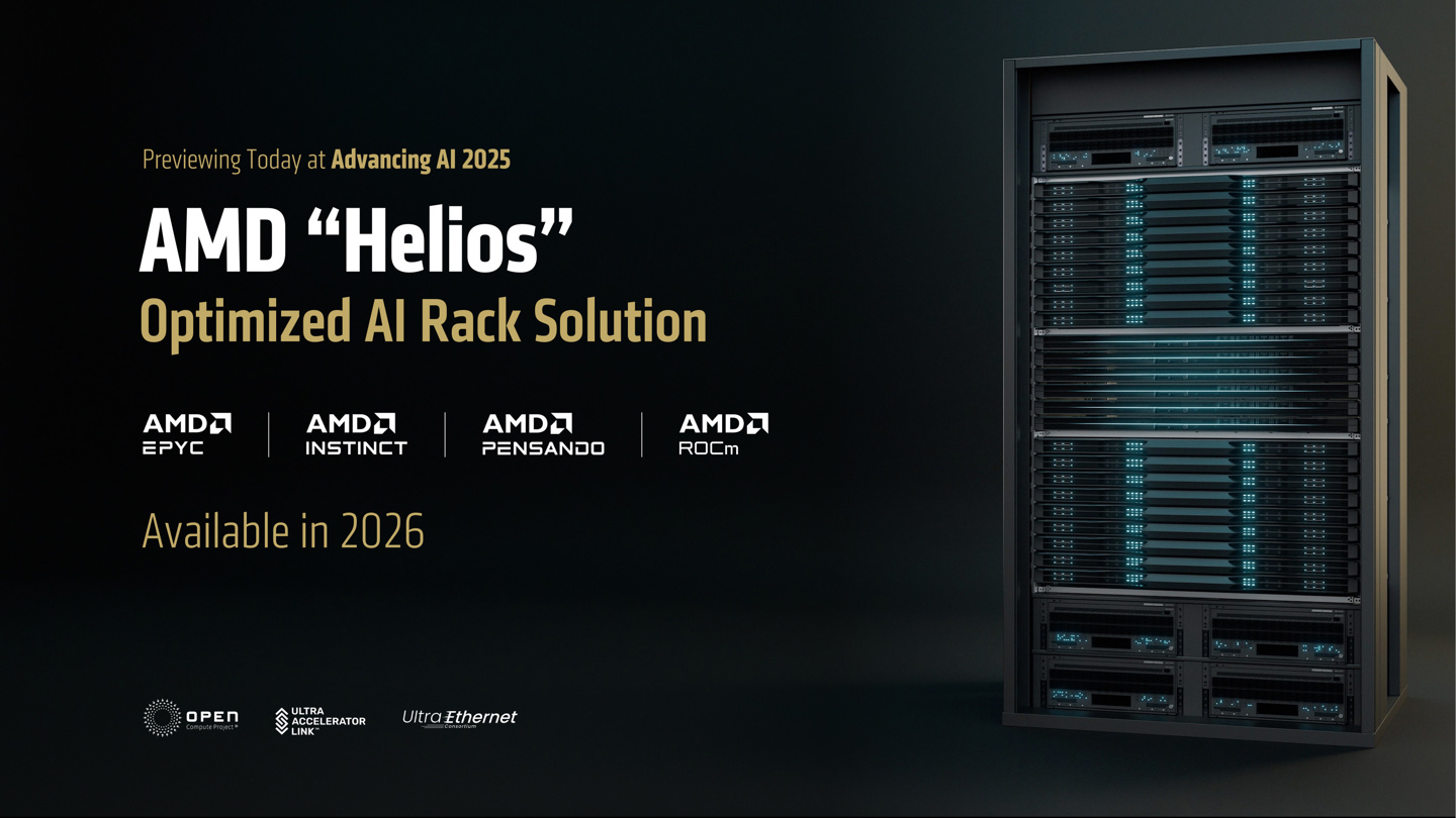 IT之家 6 月 13 日消息,AMD 在 Advancing AI 2025 大会上预览介绍了搭载下一代 Instinct MI400 显卡加速器的 Helios AI 机架解决方案。