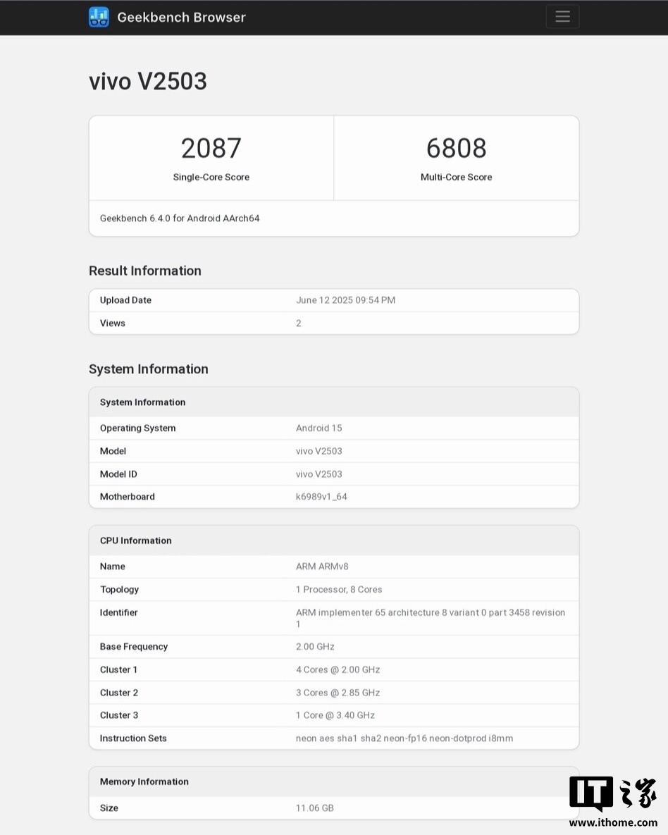vivo X200 FE(型号 V2503)在 Geekbench 6.4 测试中取得单核 2087 分、多核 6808 分的成绩,配备 12GB 内存并运行 Android 15 系统。作为对比,量产机天玑 9300 单核跑分为 2264,多核跑分为 7857。