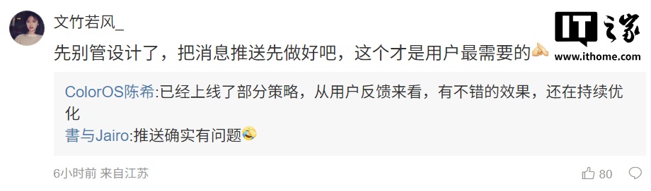 此外,有用户吐槽 ColorOS 的消息推送,陈希表示“已经上线了部分策略,从用户反馈来看,有不错的效果,还在持续优化”。
