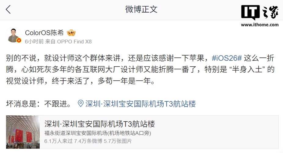 安卓手机厂商是否会跟进 iOS 26 的设计呢?OPPO ColorOS 设计总监陈希今日发布微博表示: