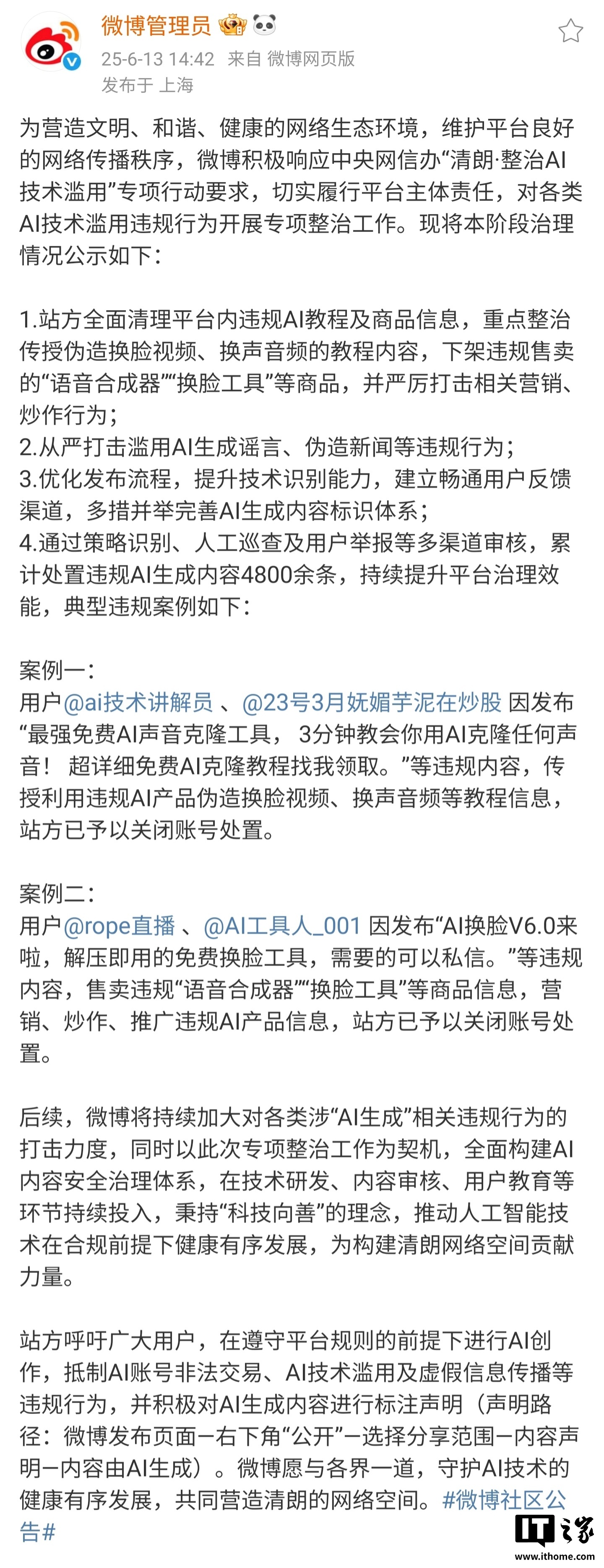 IT之家 6 月 13 日消息,微博官方账号 @微博管理员 今日发文称,为营造文明、和谐、健康的网络生态环境,维护平台良好的网络传播秩序,微博积极响应中央网信办“清朗・整治 AI 技术滥用”专项行动要求,切实履行平台主体责任,对各类 AI 技术滥用违规行为开展专项整治工作。现将本阶段治理情况公示如下: