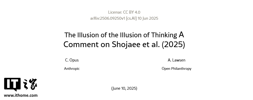 Open Philanthropy 的研究员 Alex Lawsen 近日发布反驳文章《The Illusion of the Illusion of Thinking》,认为苹果的研究结果更多反映了实验设计的缺陷,而非模型推理能力的真正局限。他在文章中直言,苹果的研究混淆了输出限制和评估设置问题,与实际推理失败无关。