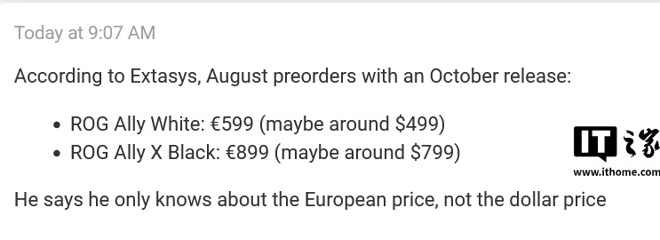 在售价方面,消息源在欧洲市场,称白色版 ROG Xbox Ally 定价为 599 欧元(IT之家注:现汇率约合 4967 元人民币),而黑色版(性能更强)的 ROG Xbox Ally X,定价高达 899 欧元(现汇率约合 7455 元人民币)。