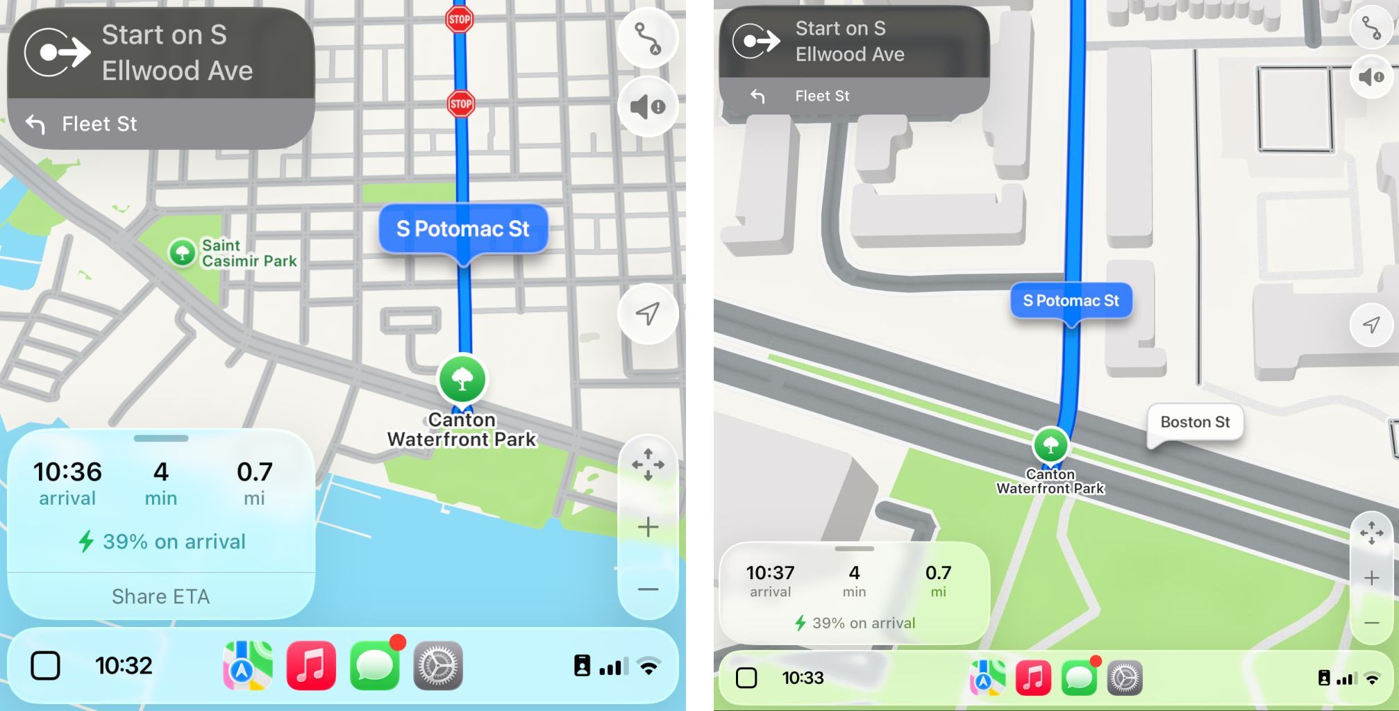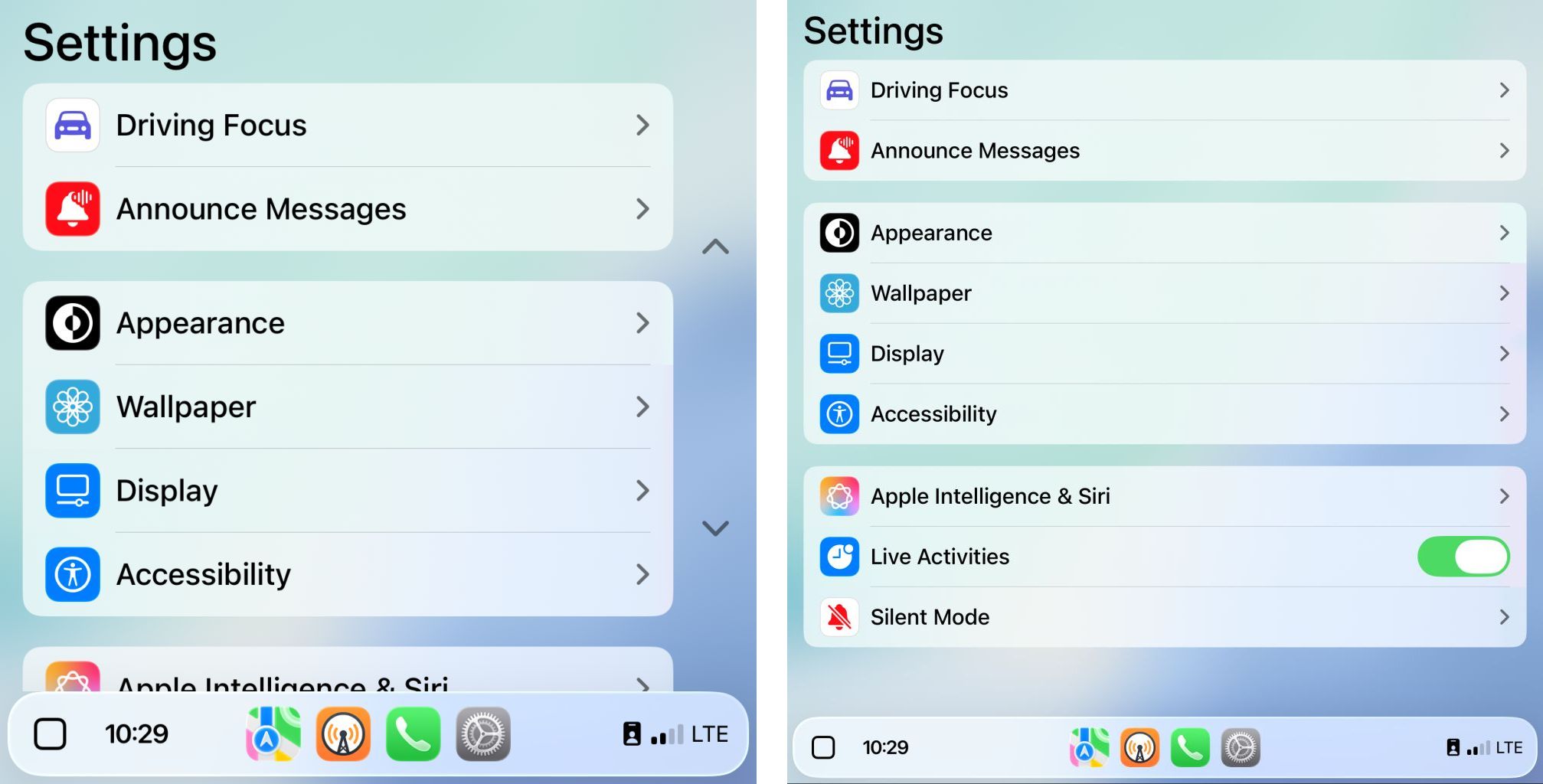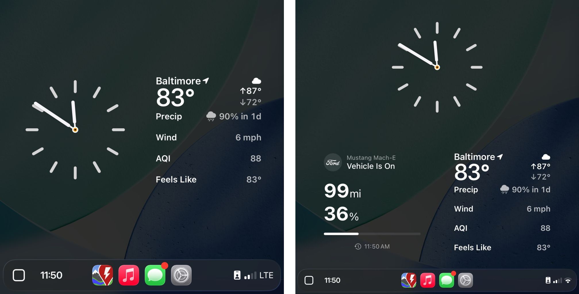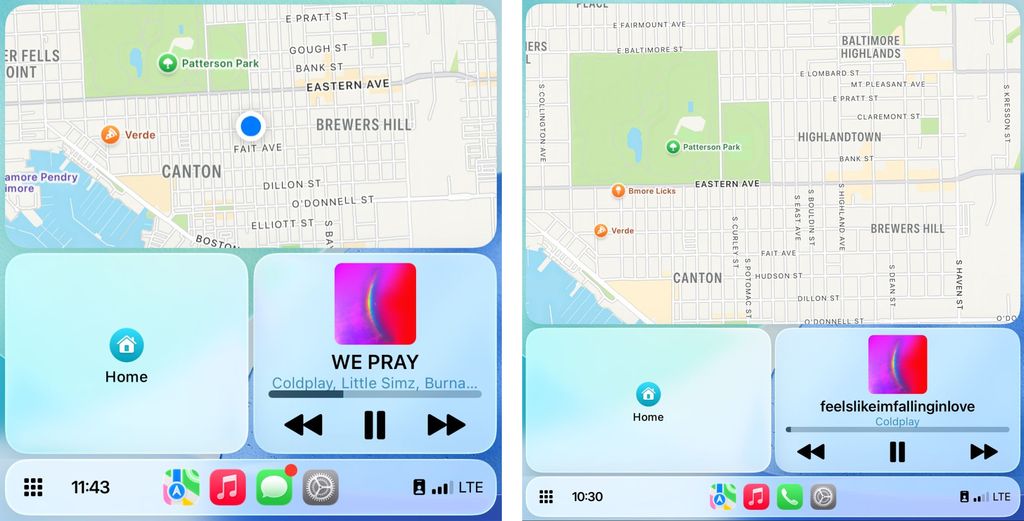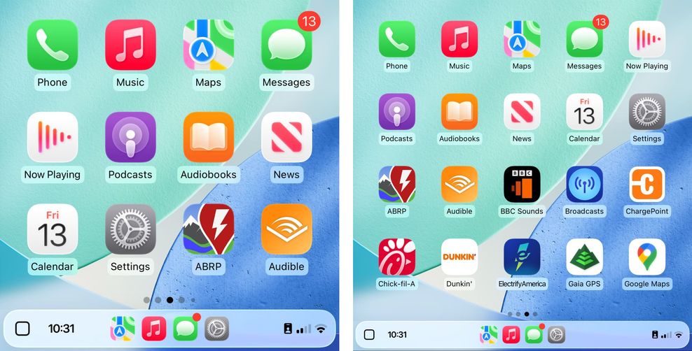 CarPlay Dashboard,左为默认缩放,右为“智能显示缩放”,下同