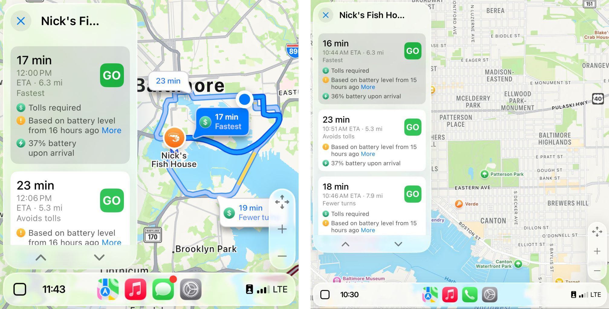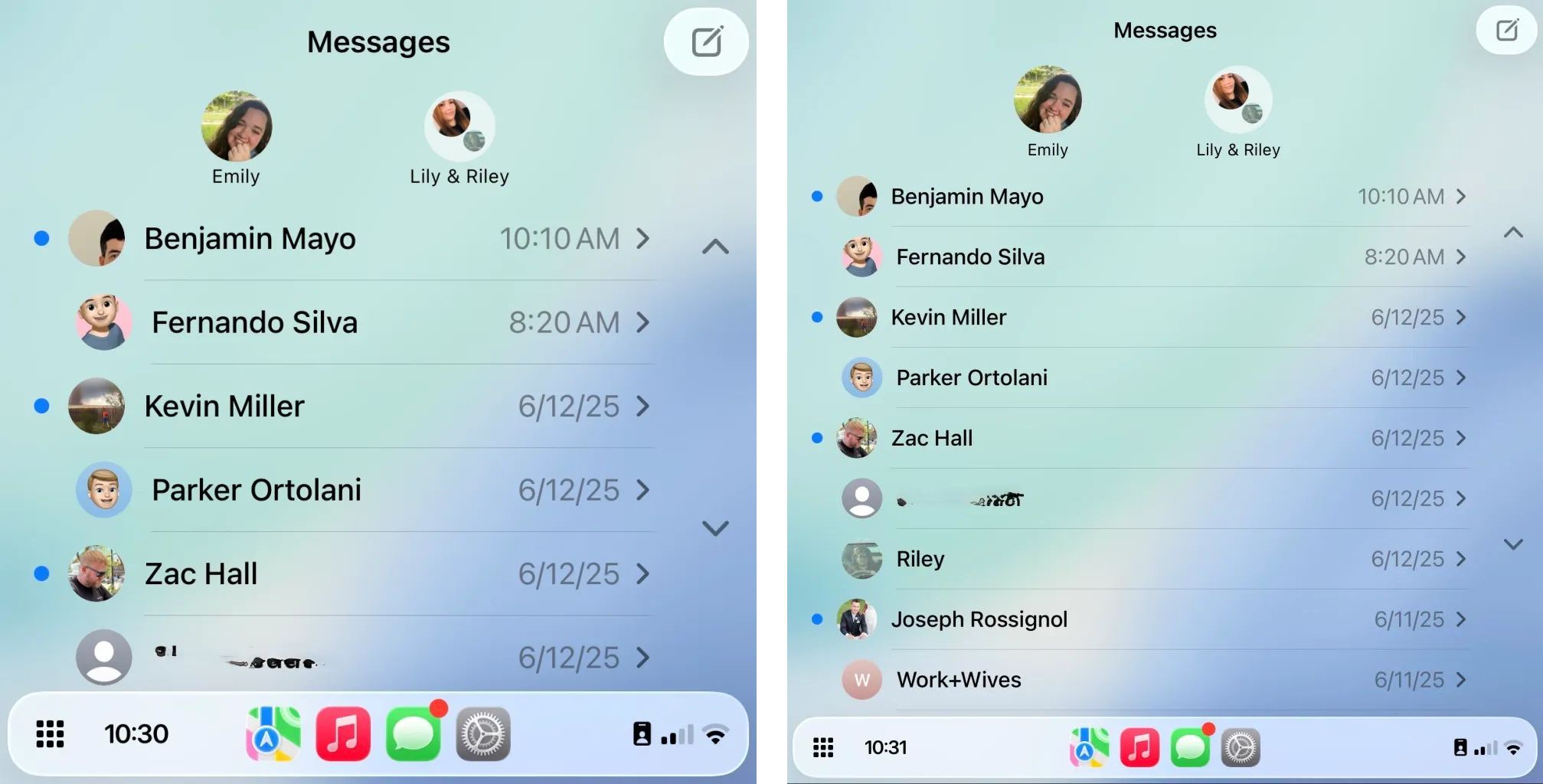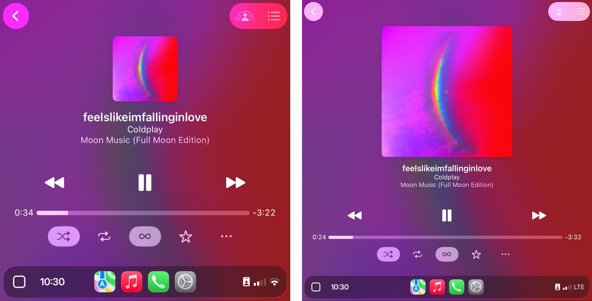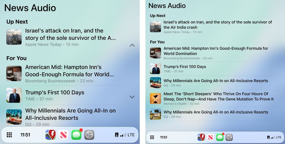 CarPlay Dashboard,左为默认缩放,右为“智能显示缩放”,下同