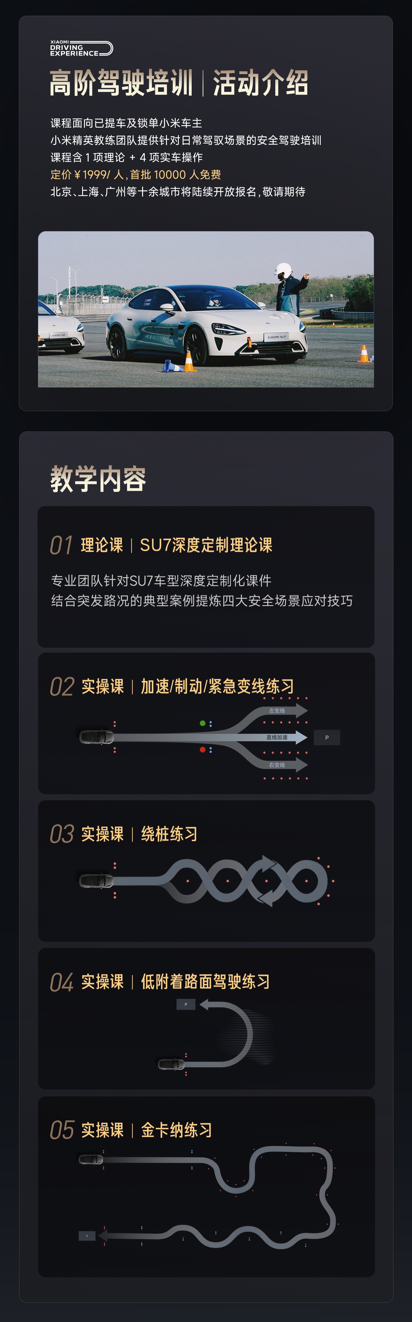 IT之家注意到,在此前的小米发布会上,小米创始人雷军称,小米精英驾驶旨在全面提升车主从理论到实践的驾驶操控能力,培训定价为 1999 元,面向小米汽车车主首批 10000 人免费。