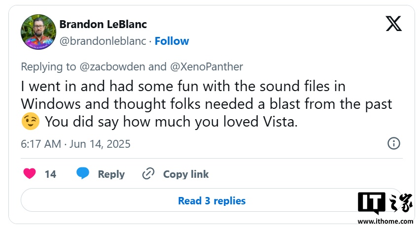 微软明确表示,Windows 11 预览版中的启动音效替换并非有意为之。Windows Insider 团队成员 Brandon LeBlanc 在 X 平台上确认,这是一个错误。他还调侃道,由于苹果的最新发布,大家又开始热议 Windows Vista 了。