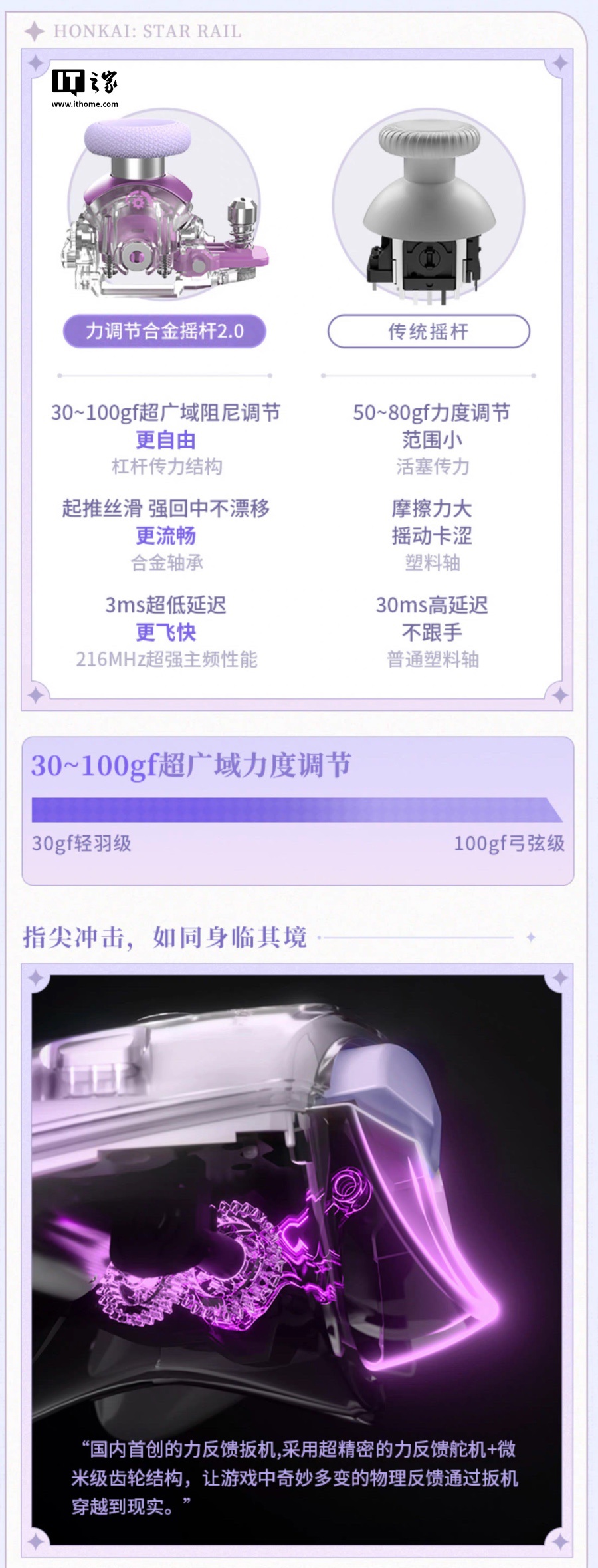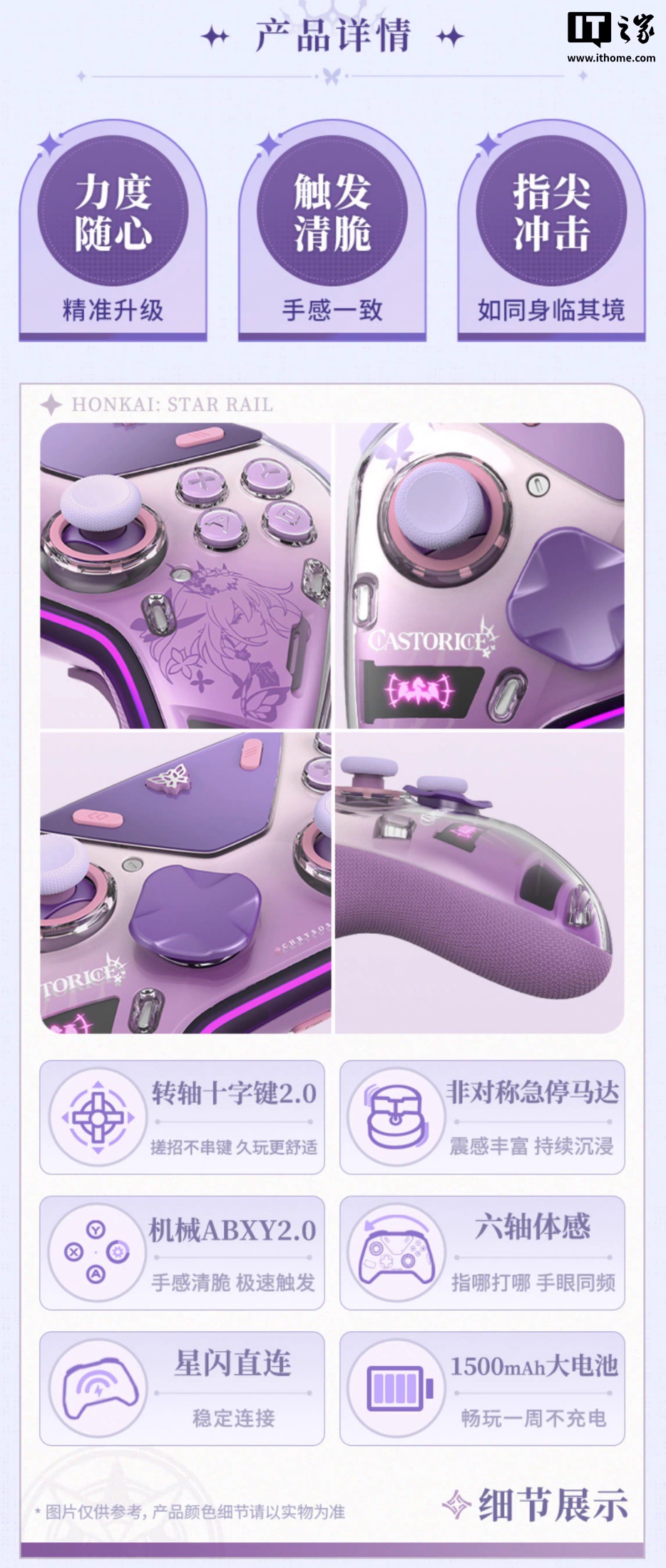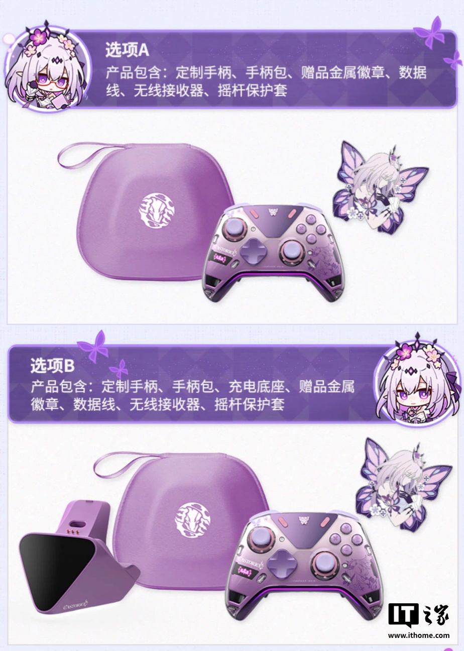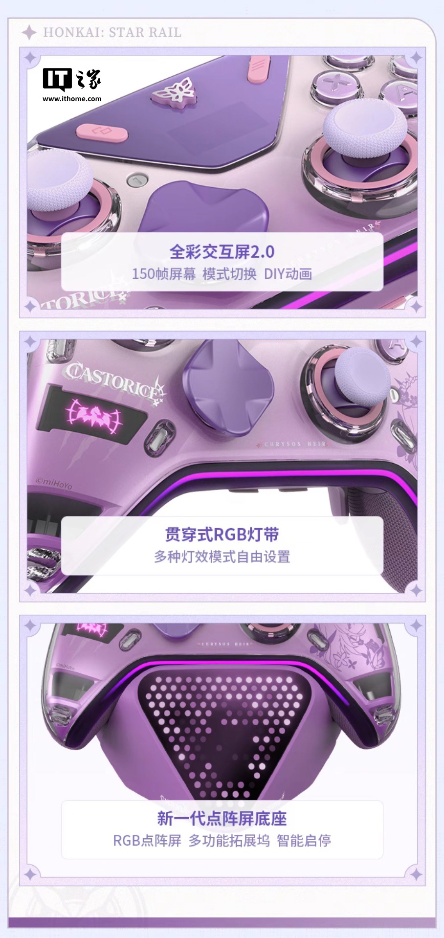 IT之家 6 月 17 日消息,米哈游与飞智合作,宣布推出一款遐蝶力反馈精英手柄,这款手柄实际上就是飞智八爪鱼 5 的联名定制款,引入《崩坏:星穹铁道》中遐蝶 IP 元素,本体加手柄包加金属徽章定价为 799 元,带底座的套装为 899 元,将于今年 10 月开始发货。