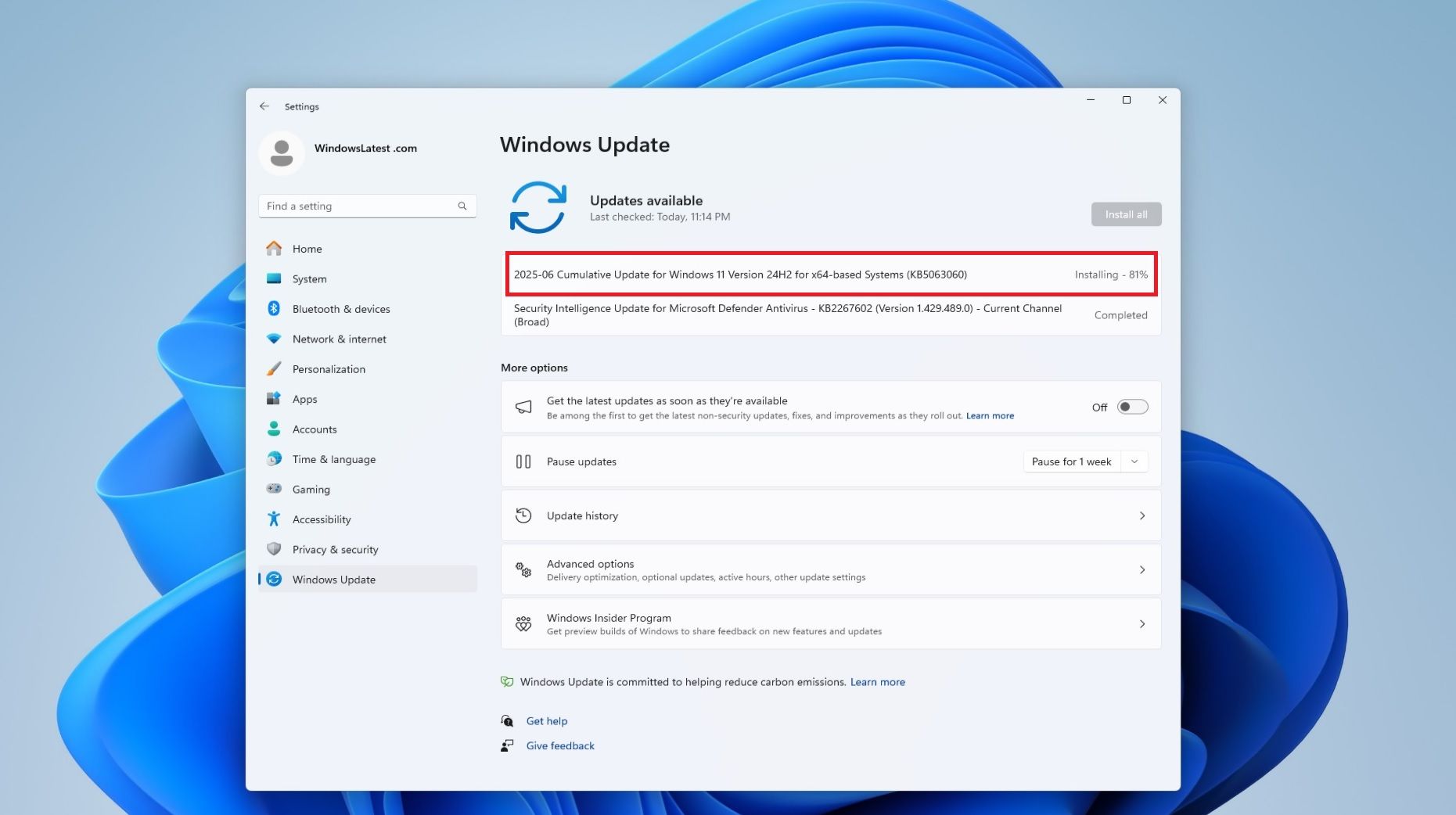 微软推荐所有 Windows 11 24H2 设备用户立即安装 KB5062324 更新,且安装该更新后不需要重启。