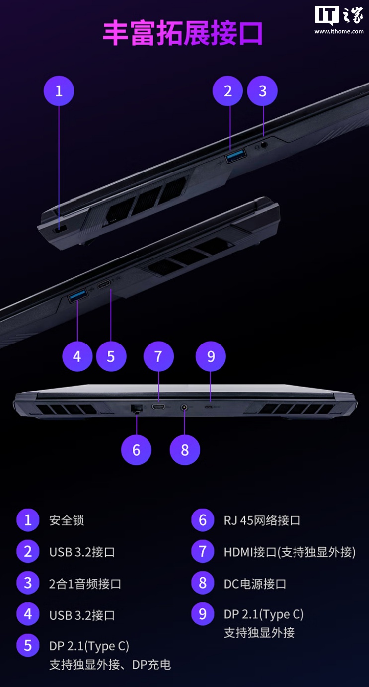 该机支持 Wi-Fi 7、蓝牙 5.4,配有 RGB 背光键盘、物理关闭摄像头,接口包括 USB-A、USB-C(支持 PD 供电)、HDMI、音频接口、RJ45 网口。