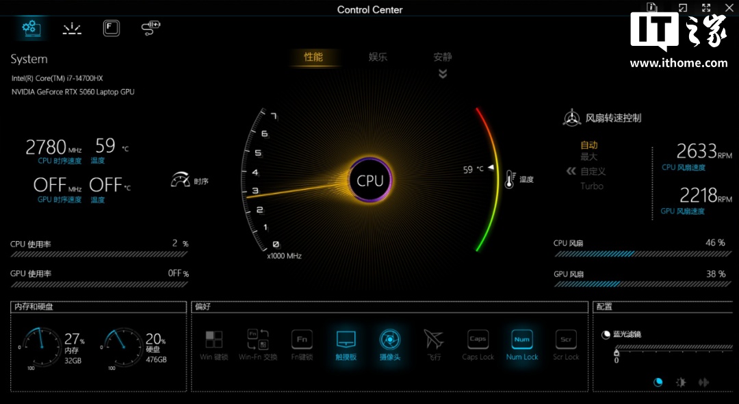 17.3 英寸魔鬼鱼系列 D17 搭载英特尔酷睿 i7-14700HX 处理器,采用 20 核心 28 线程架构,睿频至高可达 5.5GHz。新机的显卡则搭载 115W 满功耗版 8GB 显存的 RTX 5060,自带控制中心,支持安静模式、娱乐模式和性能模式切换。