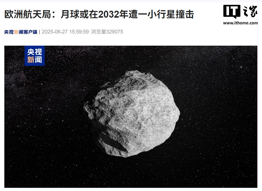 IT之家 6 月 27 日消息,据央视新闻报道,欧洲航天局当地时间 6 月 27 日公布对近地小行星 2024 YR4 的最新观测分析,确认该天体在 2032 年 12 月撞击月球的概率约为 4%,但对地球不构成直接威胁。