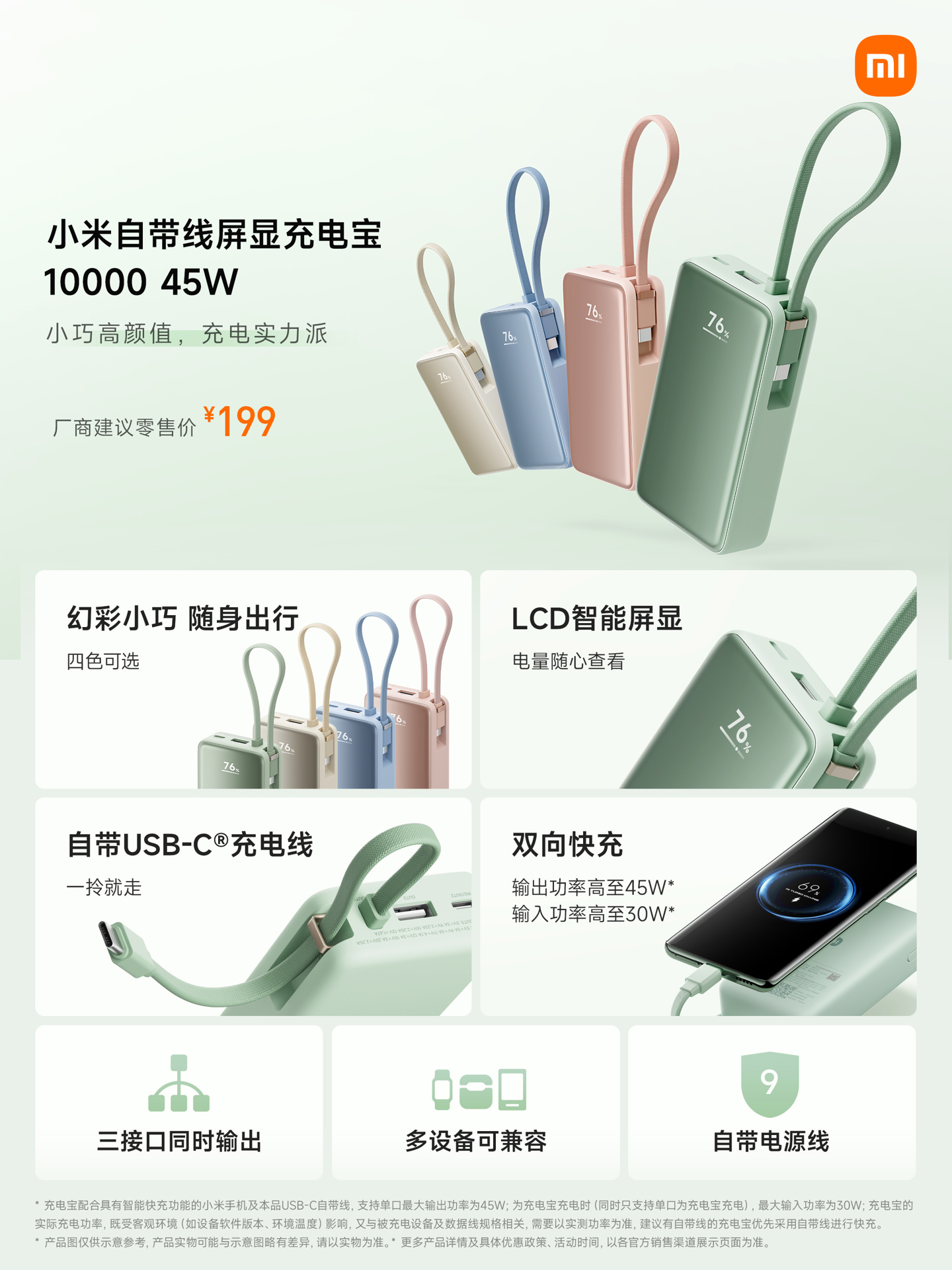 IT之家 7 月 1 日消息,小米自带线屏显充电宝 10000 45W 已开售,售价 199 元。