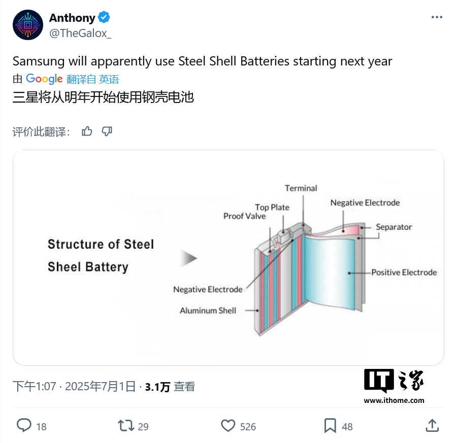 IT之家 7 月 2 日消息,科技媒体 SamLover 昨日(7 月 1 日)发布博文,报道称三星正研发名为“SUS CAN”的新技术,从明年开始装备钢壳电池。