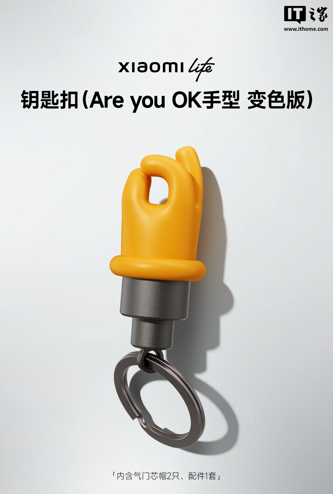 据IT之家了解,这款钥匙扣的设计灵感来源于小米创始人雷军的经典语录“Are you OK”,并巧妙地将其融入到产品设计中。钥匙扣以“OK”手势为造型,添加感光粉,在阳光的照射下,气门芯帽会迅速变黑,失去光照后颜色又能快速复原。