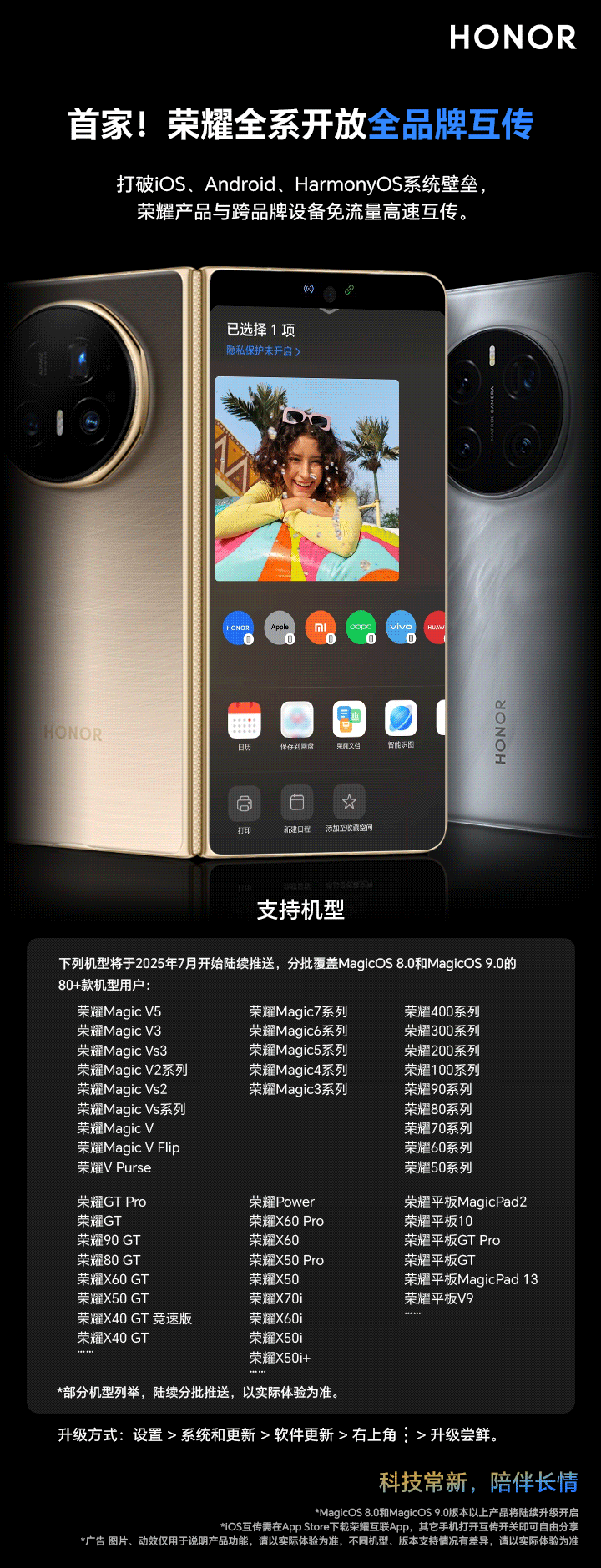IT之家从荣耀官方获悉,荣耀 Magic7 等 80+ 款机型将支持全品牌互传,分享图片、视频、文件等,包括 Magic V 折叠屏系列、Magic 正代旗舰系列、数字系列、GT 系列等(该功能陆续分批推送)。