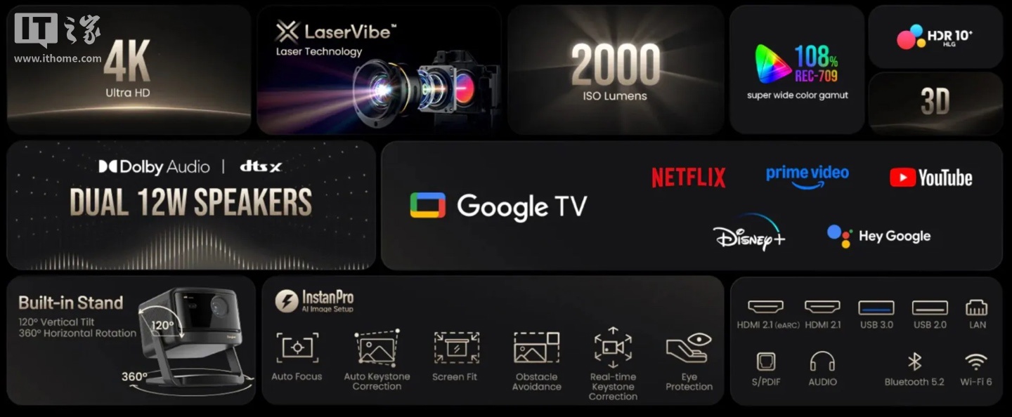 其他方面,该机支持自动对焦、自动梯形校正、屏幕贴合、避障、眼睛保护、实时梯形校正和 AI 亮度增强功能。搭载 Google TV 系统,提供 2 个 HDMI 2.1、1 个 USB-A 3.0、1 个 USB-A 2.0 、1 个 RJ45、1 个光纤、1 个 3.5mm 音频接口。
