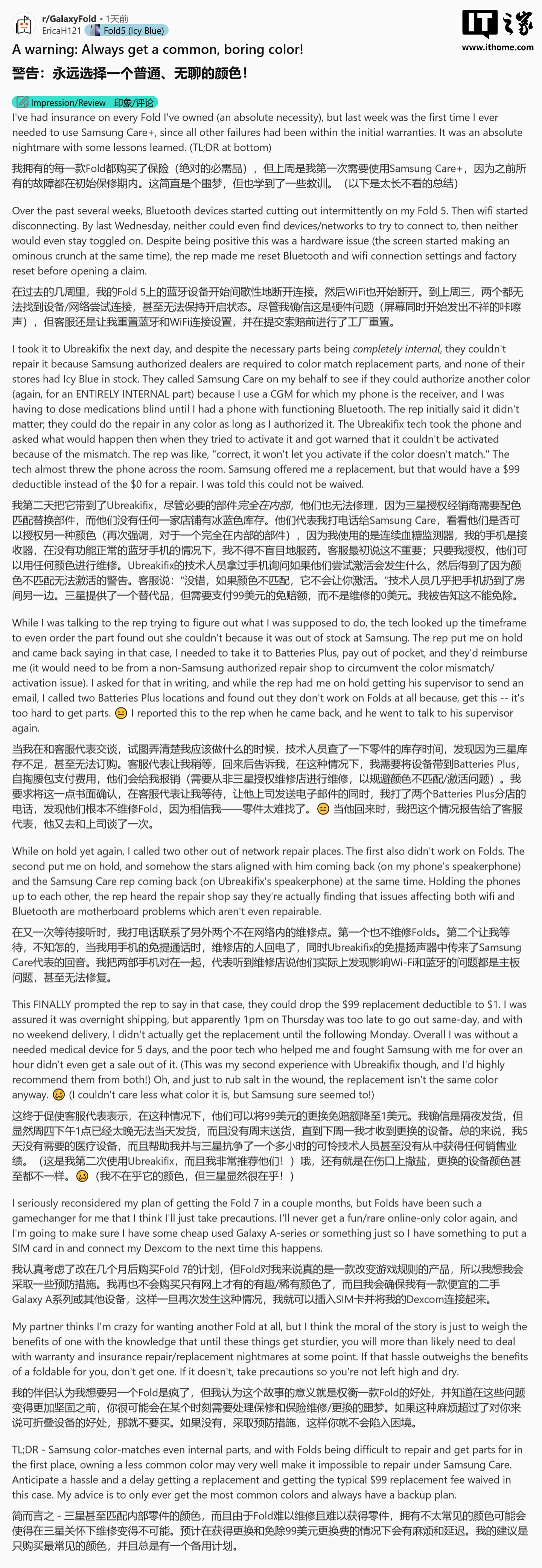 一位网友在 Reddit 社区发帖,表示在三星官方授权的服务商处,维修冰蓝色 Galaxy Z Fold5 手机时,就遇到了维修困难。