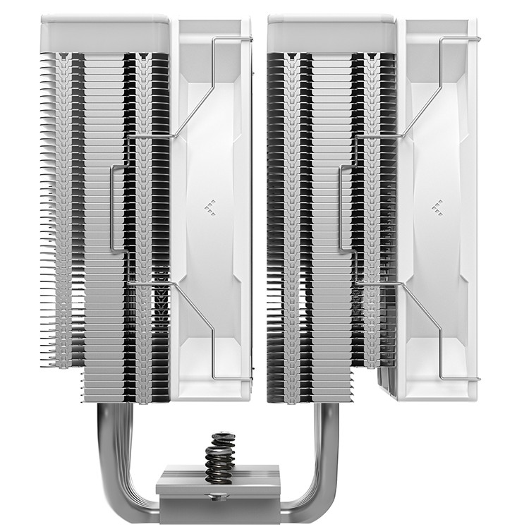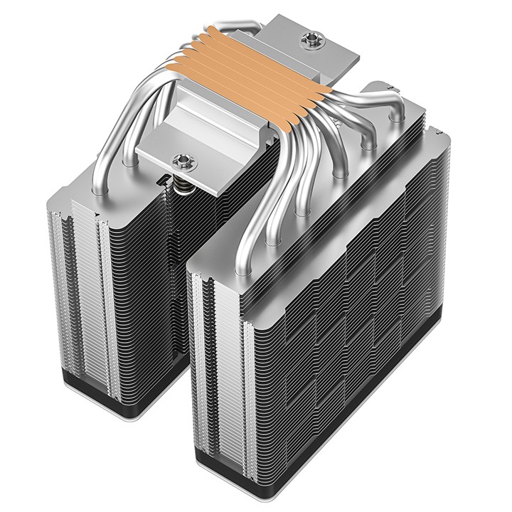 大霜塔棱镜长宽高 129×136×162 (mm),支持 45mm 高内存条。其六根 6mm 双向恒定热平衡热管采用 CTT 2.0 核心触控技术在塔体底部并管排列,相邻热管间的接触面积增加约 26%,热效能转换率相比上代 CTT 1.0 提升 12%。