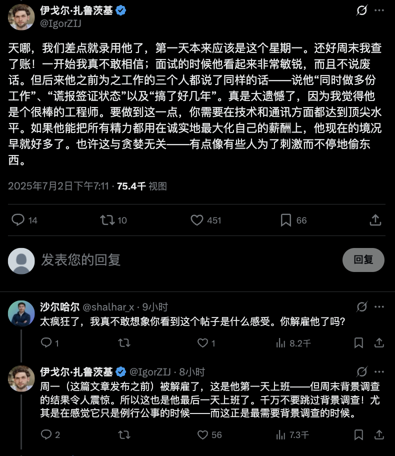有个差点就被骗到的 Igor Zalutski 小哥说,这个老哥看起来非常敏锐,而且不说废话,幸好周末做了背调,得知他不仅同时做很多工作、还谎报签证状态啥的。