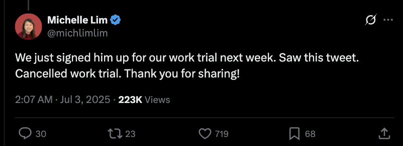 刚刚帮他报名了参加下周的工作试用。看到这条推文。工作试用取消了。