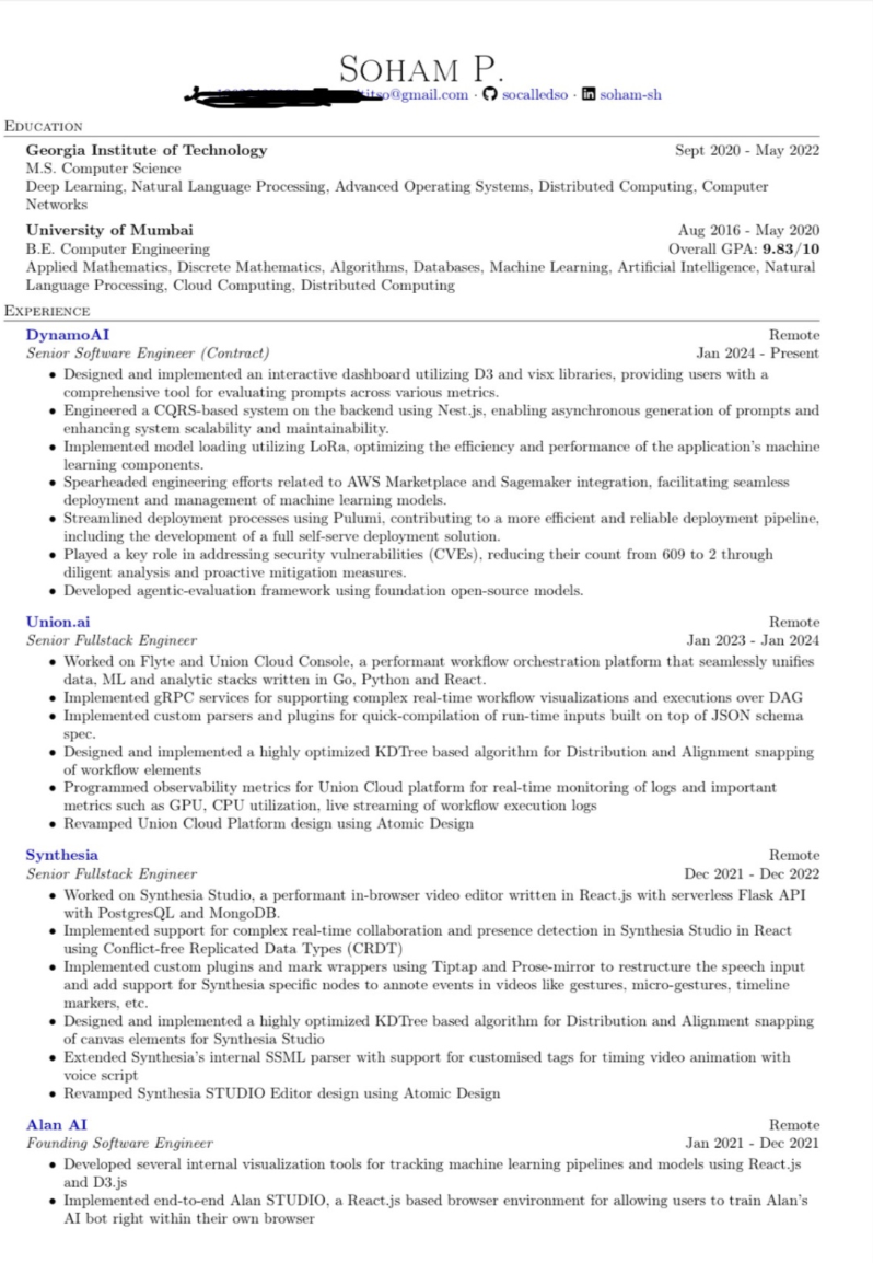 他还附上了简历,上面写着 Soham 哥本科毕业于孟买大学,硕士毕业于佐治亚理工学院计算机学院。