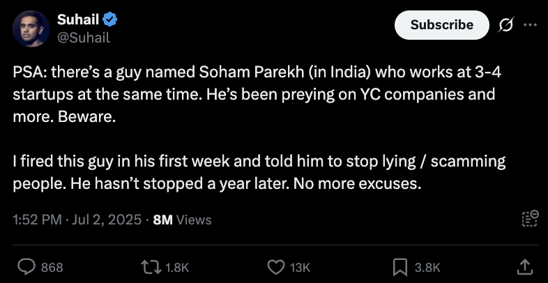他指控一个印度男子以虚假借口同时在 3 到 4 家初创公司工作。Soham Parekh 曾在他们公司短暂工作,但不到一周就被解雇了。