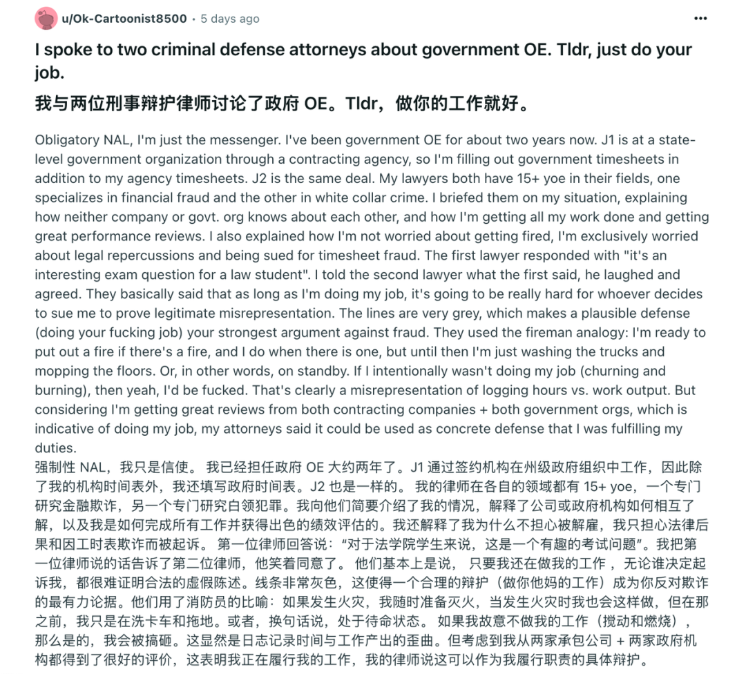 有位网友甚至扒出 Reddit 上有个 r/overemployed 社区,里面全是有类似 OE(One Employer, Multiple Jobs;一份雇主,多份工作)工作经历的人在分享经验。