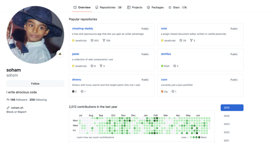不过顺着个人网站 soham.sh 找到了疑似本人的 GitHub 网页。