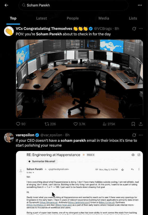 结果万万没想到,让硅谷初创公司们纷纷痛苦面具的 Soham Parekh,竟然在网络上一炮而红。
