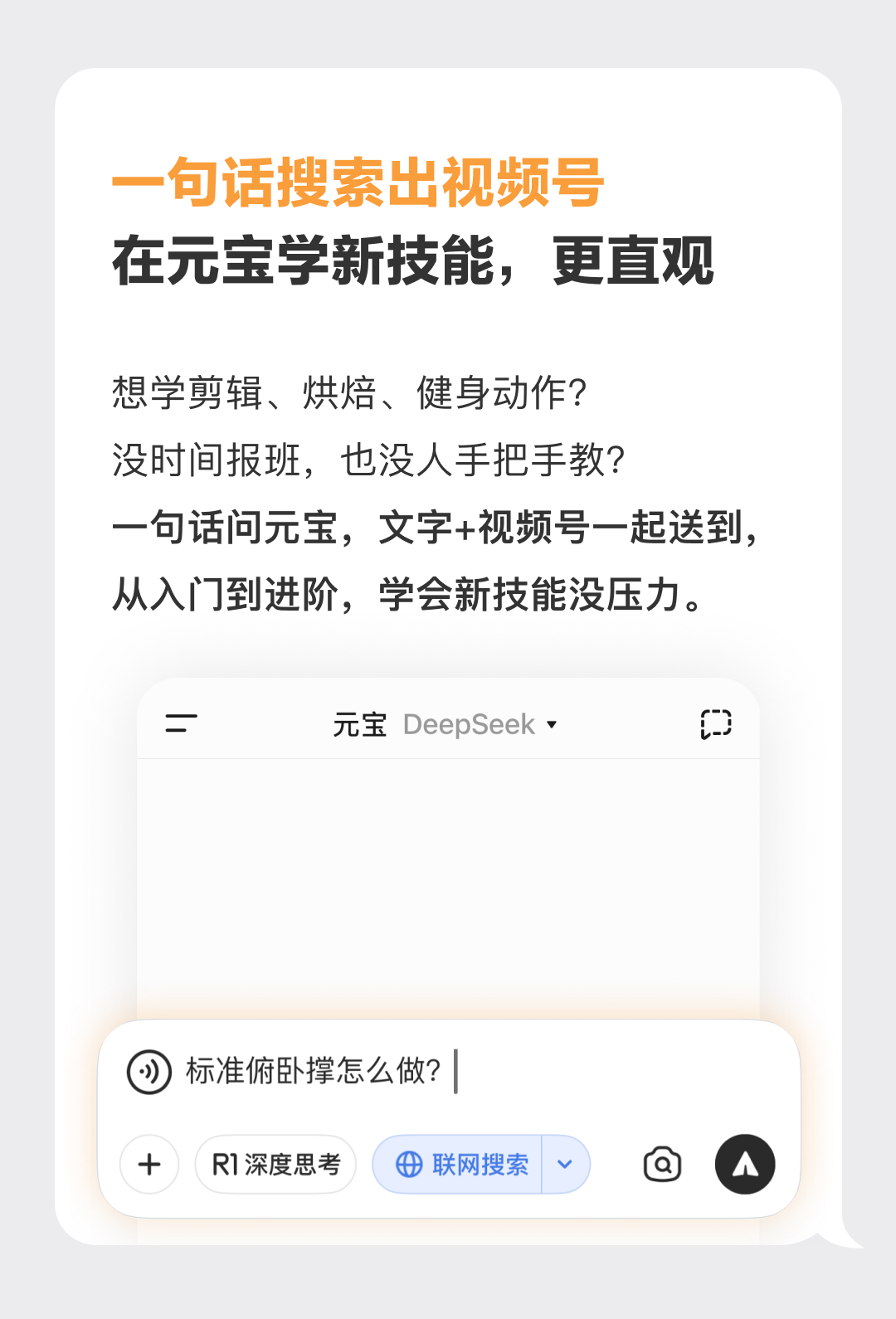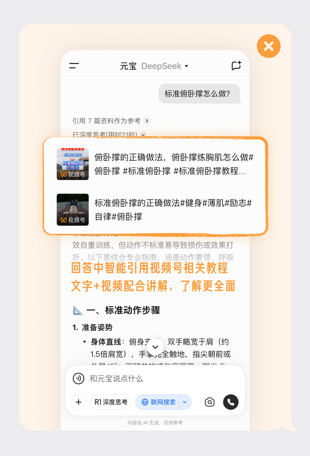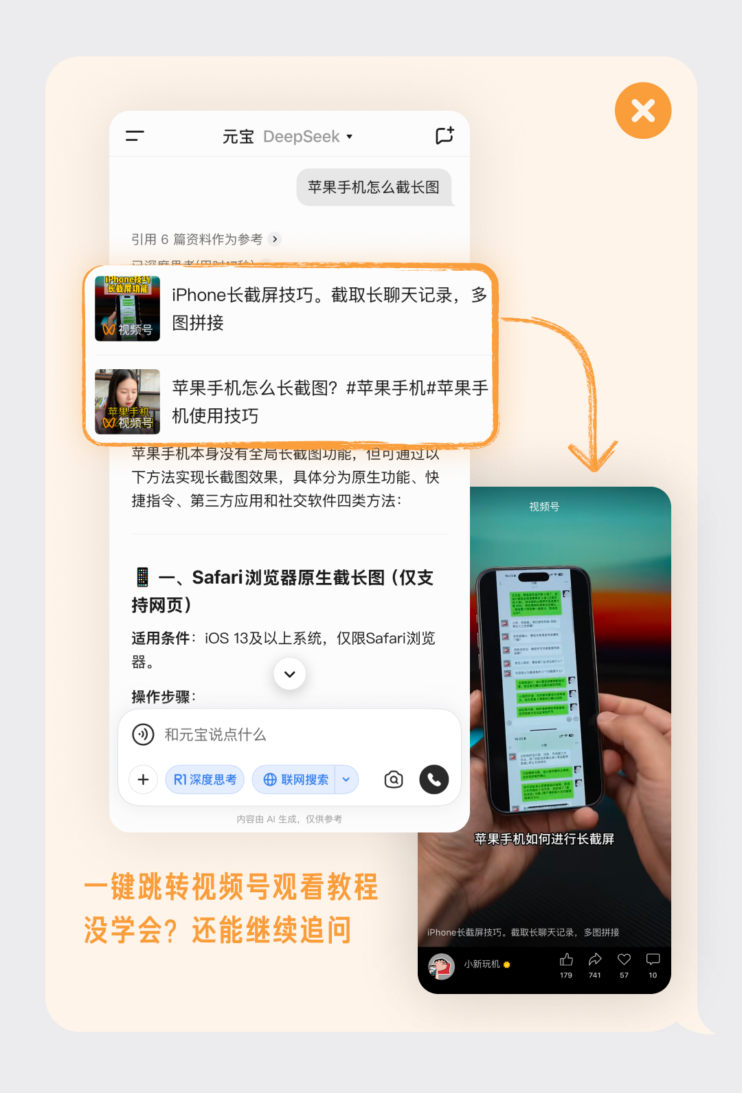 用户打开“联网搜索”,一句话提问,元宝回答即可自动匹配图片及视频号,支持任意模型,不限“深度思考”是否开启。在回答结果中,还可智能引用视频号相关教程,对用户的提问可输出文字 + 视频配合讲解的内容。同时,还支持一键跳转视频号观看教程,若用户“没学会”还可继续追问。