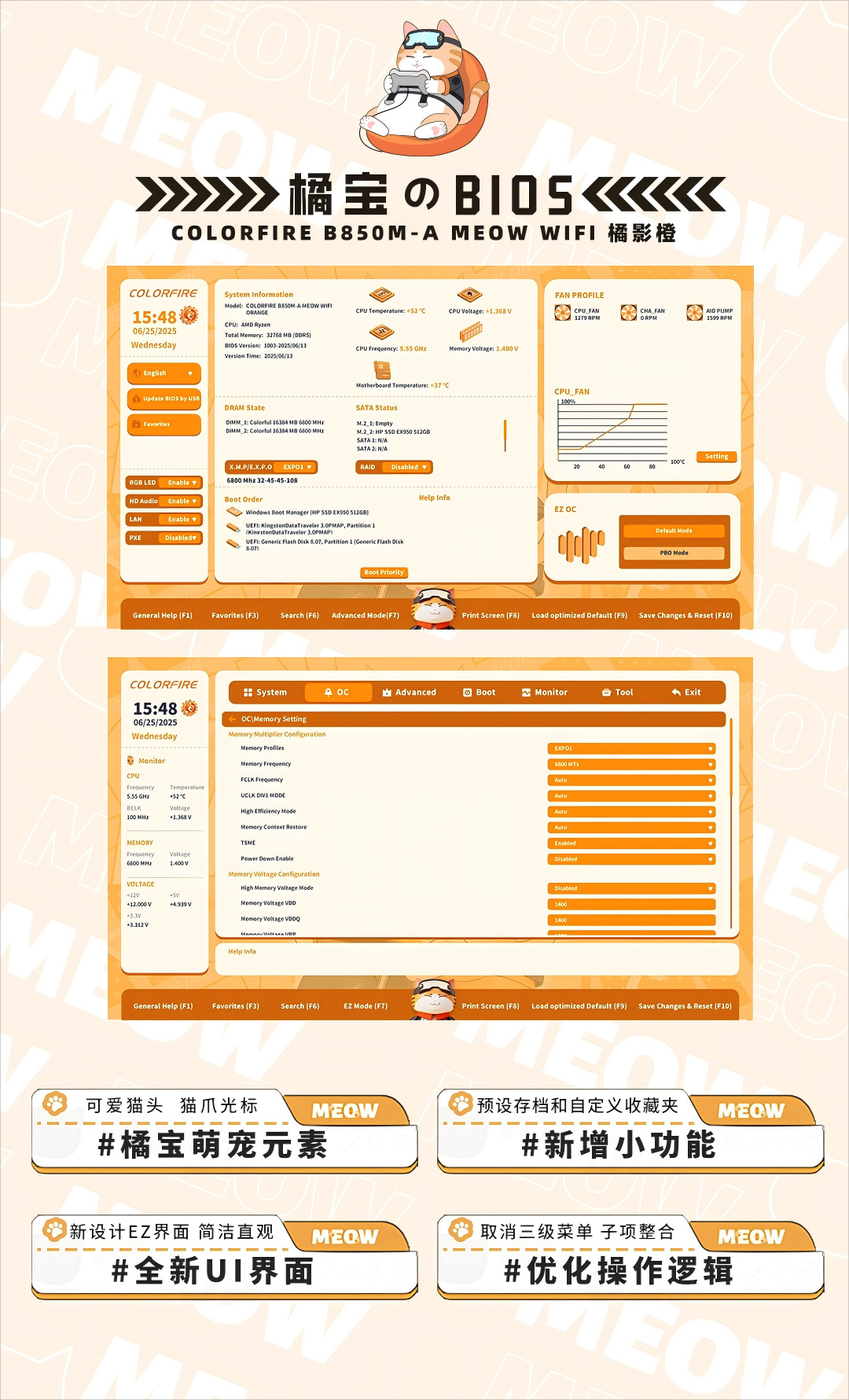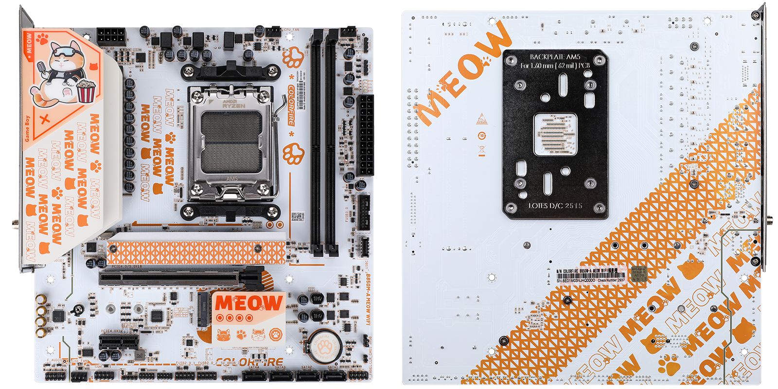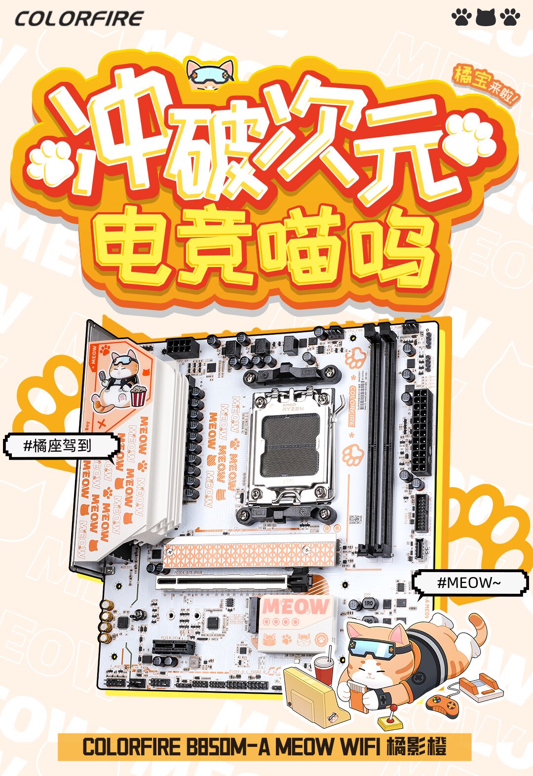 IT之家 7 月 3 日消息,七彩虹旗下 COLORFIRE 品牌此前曾在 600 系和 700 系世代推出过以“橘宝”和“疾风”两只猫咪萌宠为设计主题的风味主板产品。而在最近 COLORFIRE 又带来了新品 B850M-A MEOW WIFI 橘影橙。