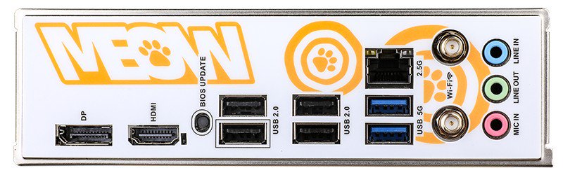 该主板采用 230mm×220mm 的非标准缩小款 M-ATX 板型,以白色为 PCB 和装甲的主题色,正面、后置 I/O 背板乃至背面均装饰以橙色图案文字,BIOS 界面也富有“橘宝”特色。