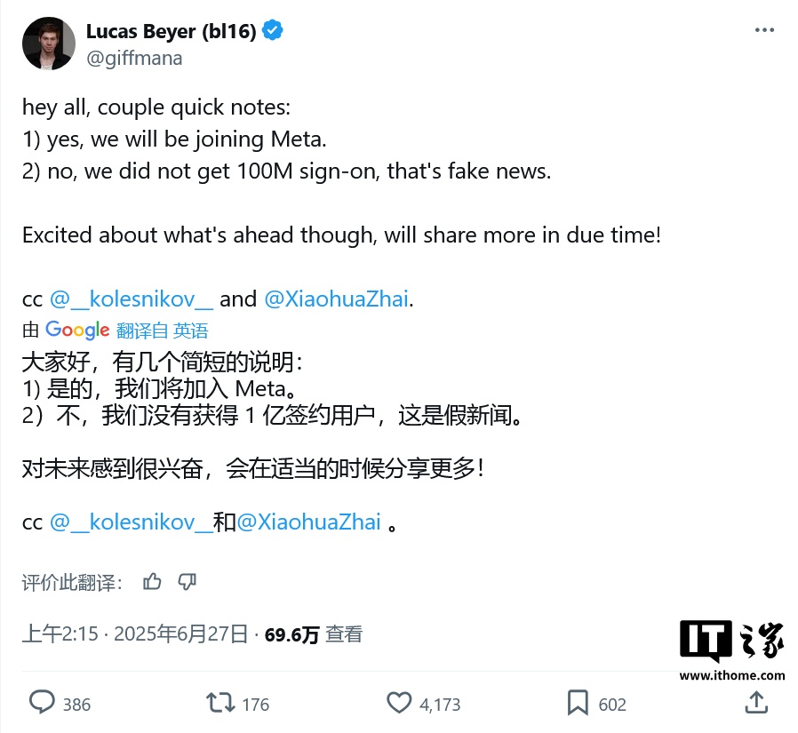 而 Lucas Beyer 在 6 月 27 日的推文中,称将加入 Meta 公司,但没有收到 1 亿美元的奖励,并称这是假新闻。