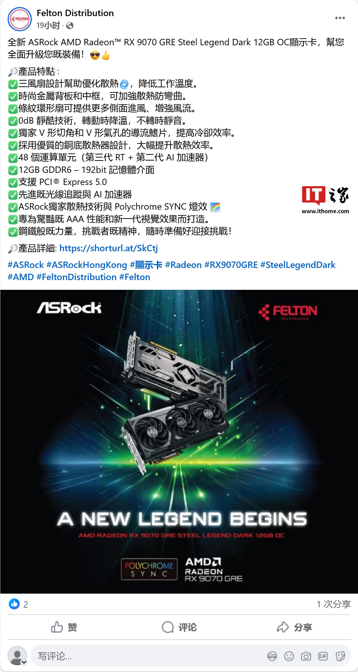IT之家 7 月 4 日消息,Felton Distribution 是一家在中国香港与澳门两特别行政区从事计算机硬件分销的企业,其昨日在脸书平台提及了首发时为中国大陆市场特供的 AMD Radeon RX 9070 GRE 12GB 显卡,具体型号是华擎的钢铁传奇黑色 OC。