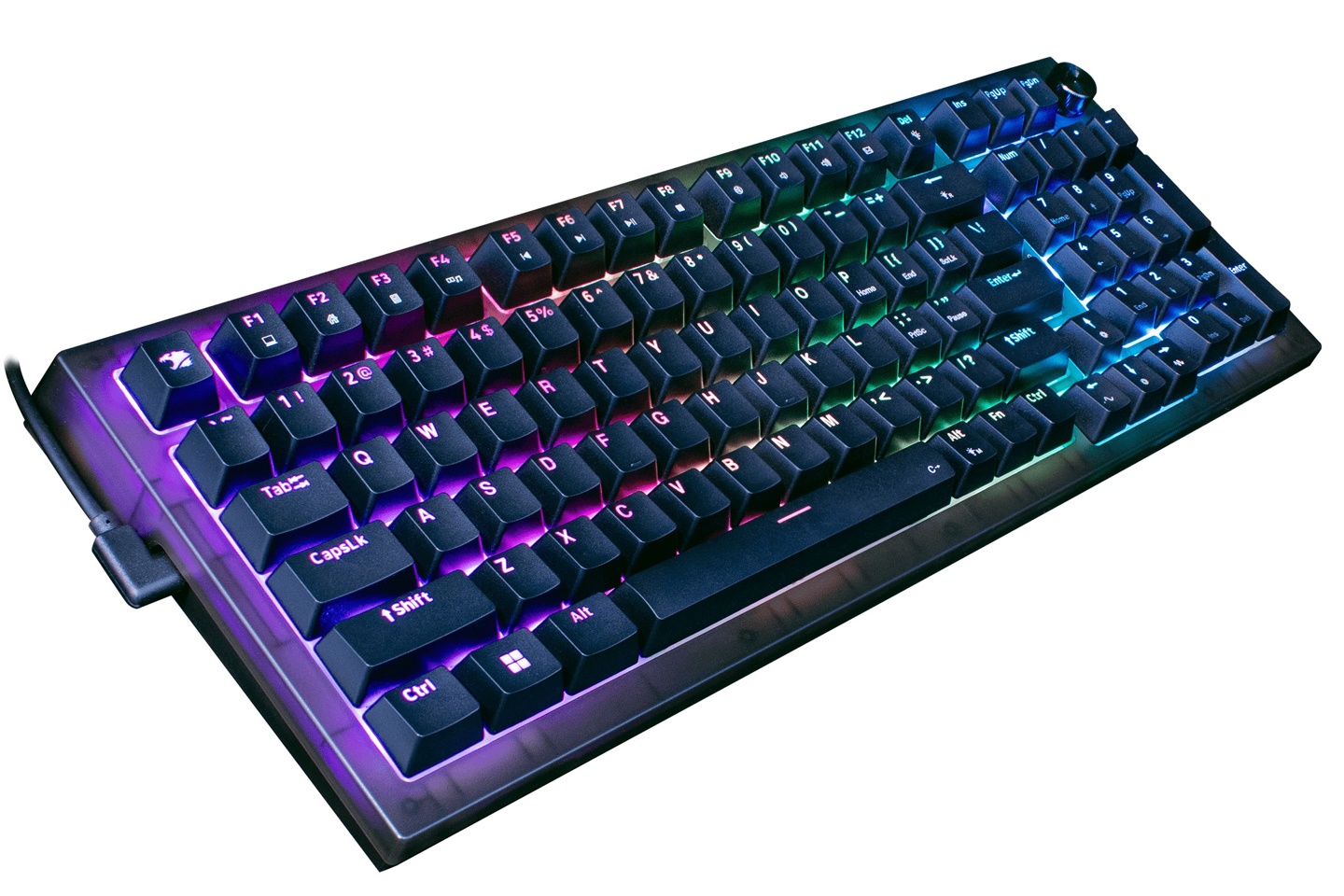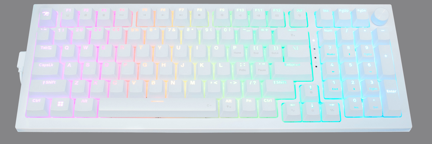 MK9 Pro 为 98 键 96% 配列,左侧出 USB Type-C 接口设计,右上角包含 1 颗音量旋钮。其采用 GASKET 垫片固定结构,PCB 支持轴体热插拔和单键 ARGB 灯效(支持通过 HYTE Nexus 设置),预装线性轴体。